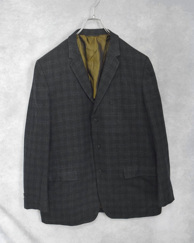 【comment】 60年代頃のシャドーチェックウールテーラードジャケット。 お色味はモノトーンのシャドーチェック。 抜群の雰囲気を醸し出しています。 生地は薄手なウールフランネル地。 真夏以外のほぼ通年着れる生地感というのも嬉しいポイント。 背面は背抜き仕立て。 フロントは3つボタン仕様。 フラップ付きの裾ポケ、背面はセンターベント。 年代らしい小ぶりなラペルで使い勝手も◎ サイズバランスは38程と抜群な具合。 内ポケにはユニチケを装備。 ジャケパンスタイルはもちろん、カットソーなどでラフに合わせるのもオススメです。 様々なアイテムと合わせてお使いいただけるかと。 お好きな方是非ご検討ください。 【date】 60s 【material】 wool 【color】 black x grey 【size】 size 38 肩幅 50cm / 身幅 61.5cm / 袖丈 (肩から) 64cm / 着丈 78cm 着用者 168cm 痩せ型 【condition】 右袖裏地に小さなダメージがありますが着用には問題ありません。 その他は程良い着用感がございます。 【notice】 ※ユーズド商品ですので、神経質な方はご遠慮ください。 ※見落としなどの汚れやダメージがある場合もありますのでご理解下さい。 ※なるべく現物と同じ色味になるようにしていますが、写真と状態や色味が多少異なる場合もございます。 ※レターパックライトを選択頂く場合は損害補償がないことをあらかじめご了承ください。また、コワレモノ扱いができないためシルバーの場合変形する可能性がある点もご了承ください。 ※返品、交換は対応できません。予めご了承ください。