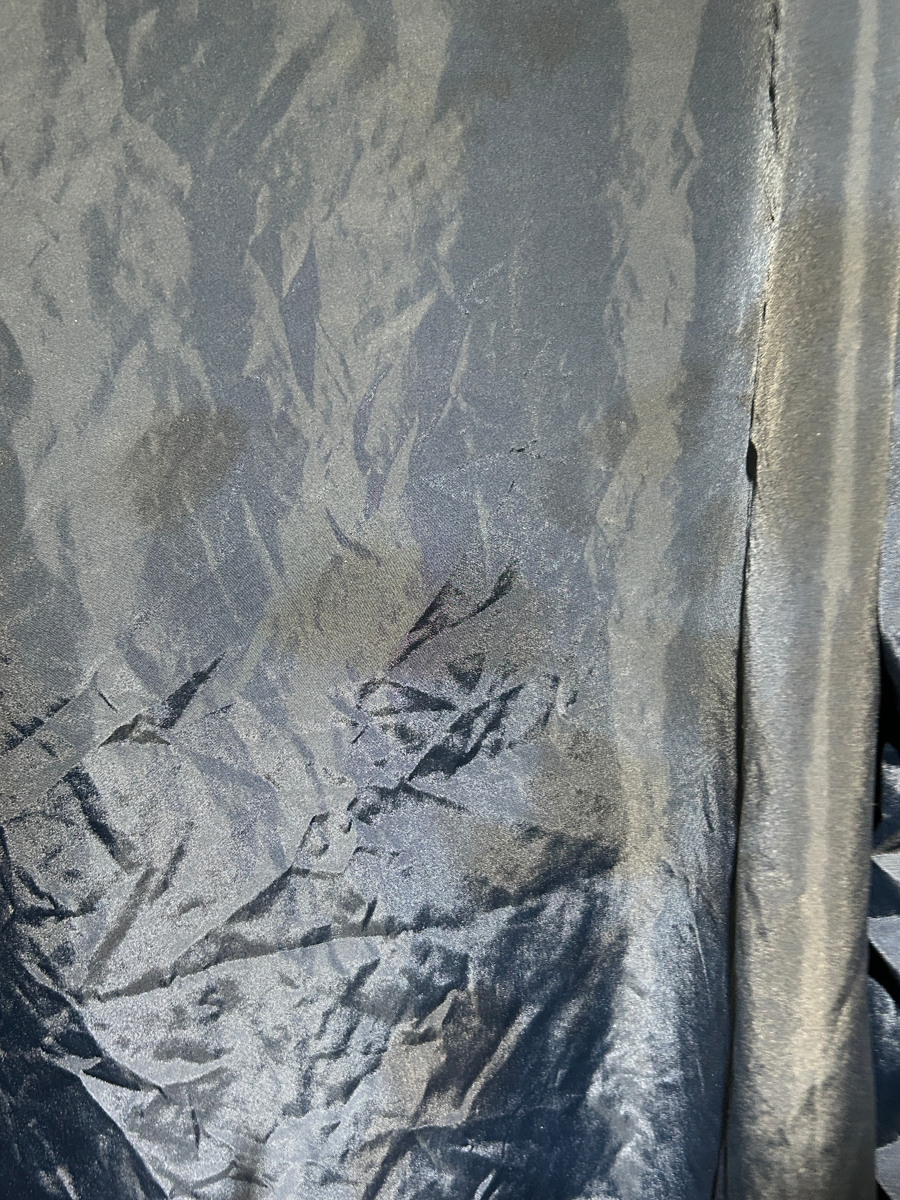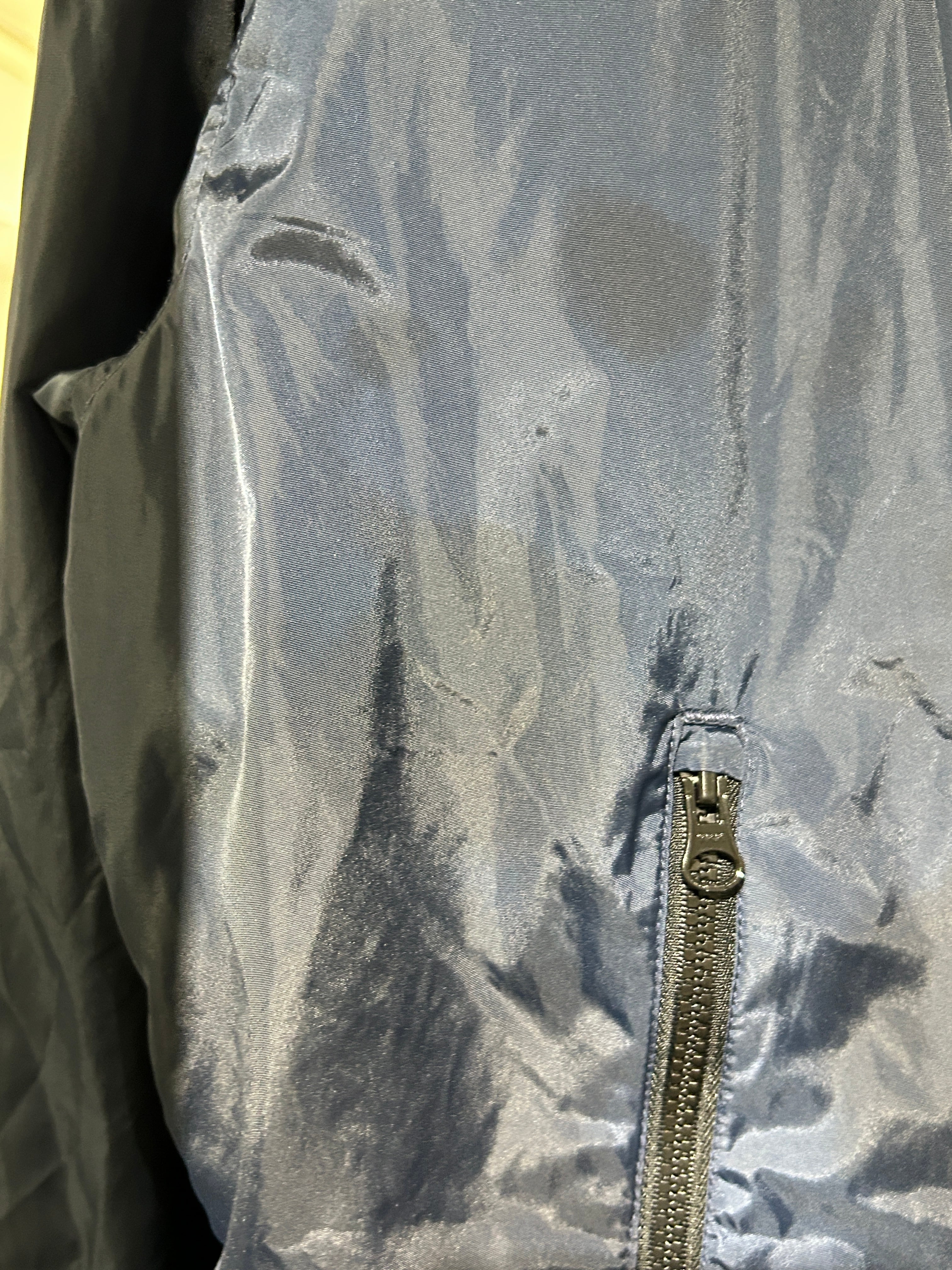 フロント右下、背面首元、裾に大きなシミがありますがナイロンの光沢のためほぼわかりません。