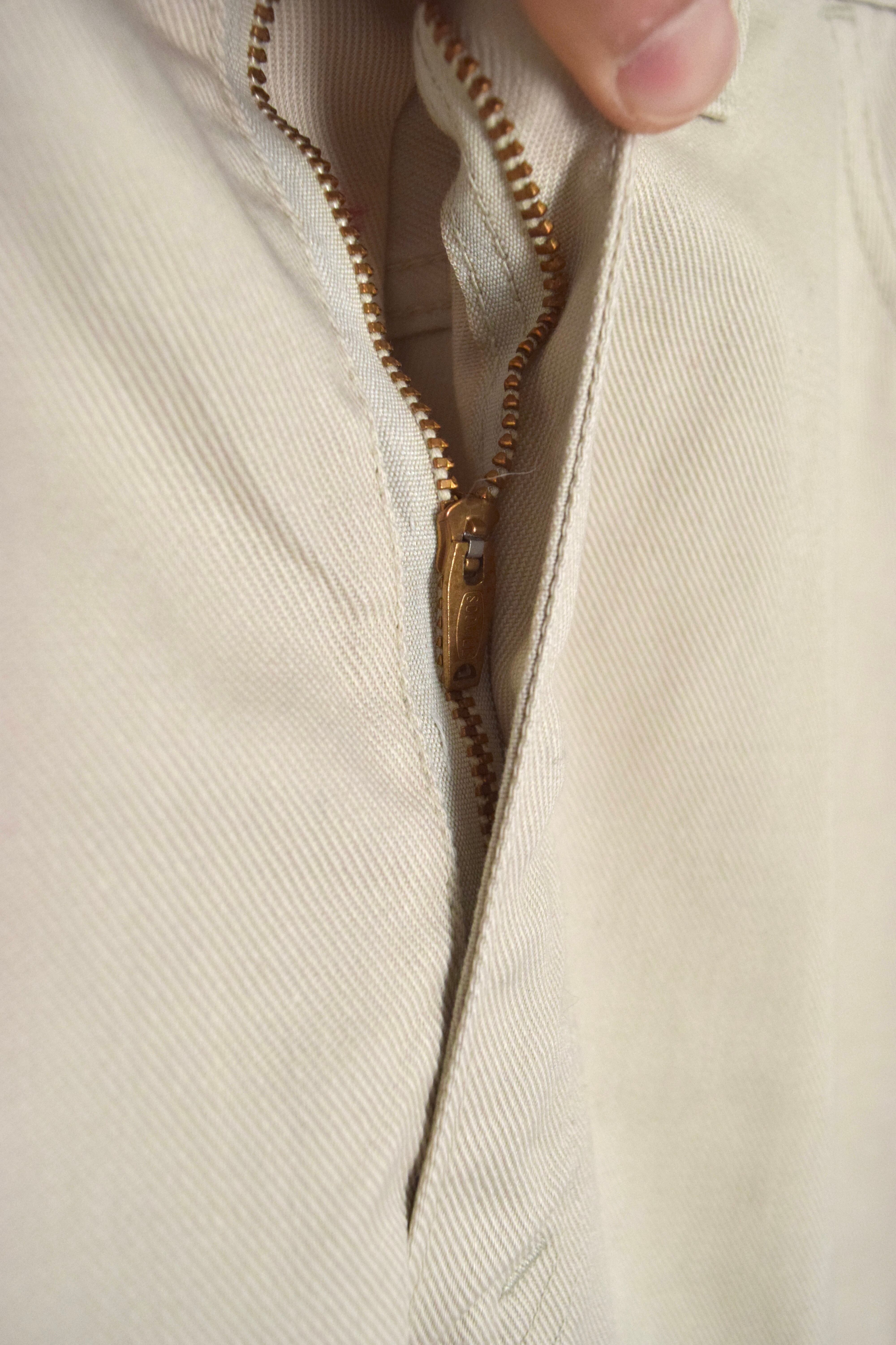 この年代のテーパードパンツはヒップをビタビタにして穿くのが流行っていたため、マイサイズで穿くのはあまりおすすめしません。