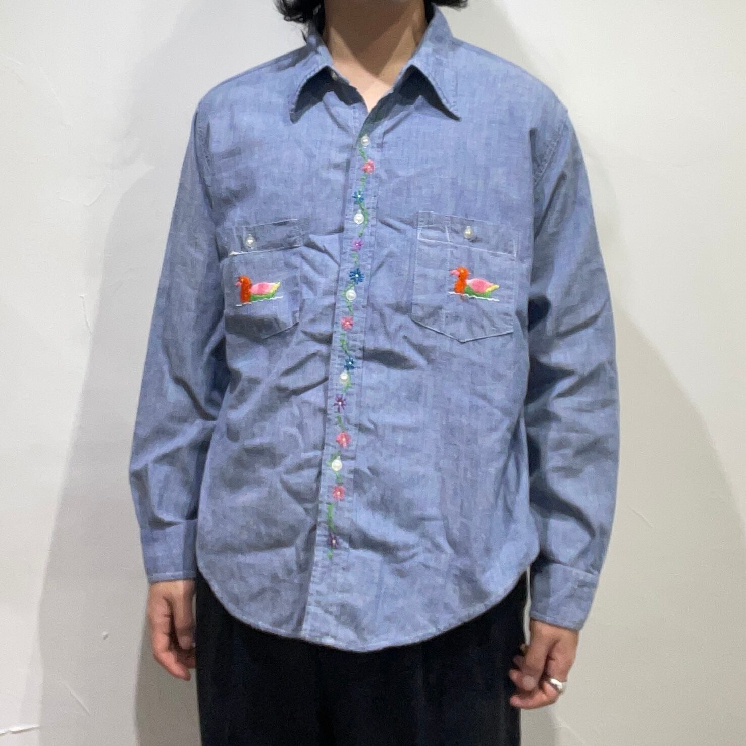 フロントにはカラフルな草花、両胸ポケットにはカモ。