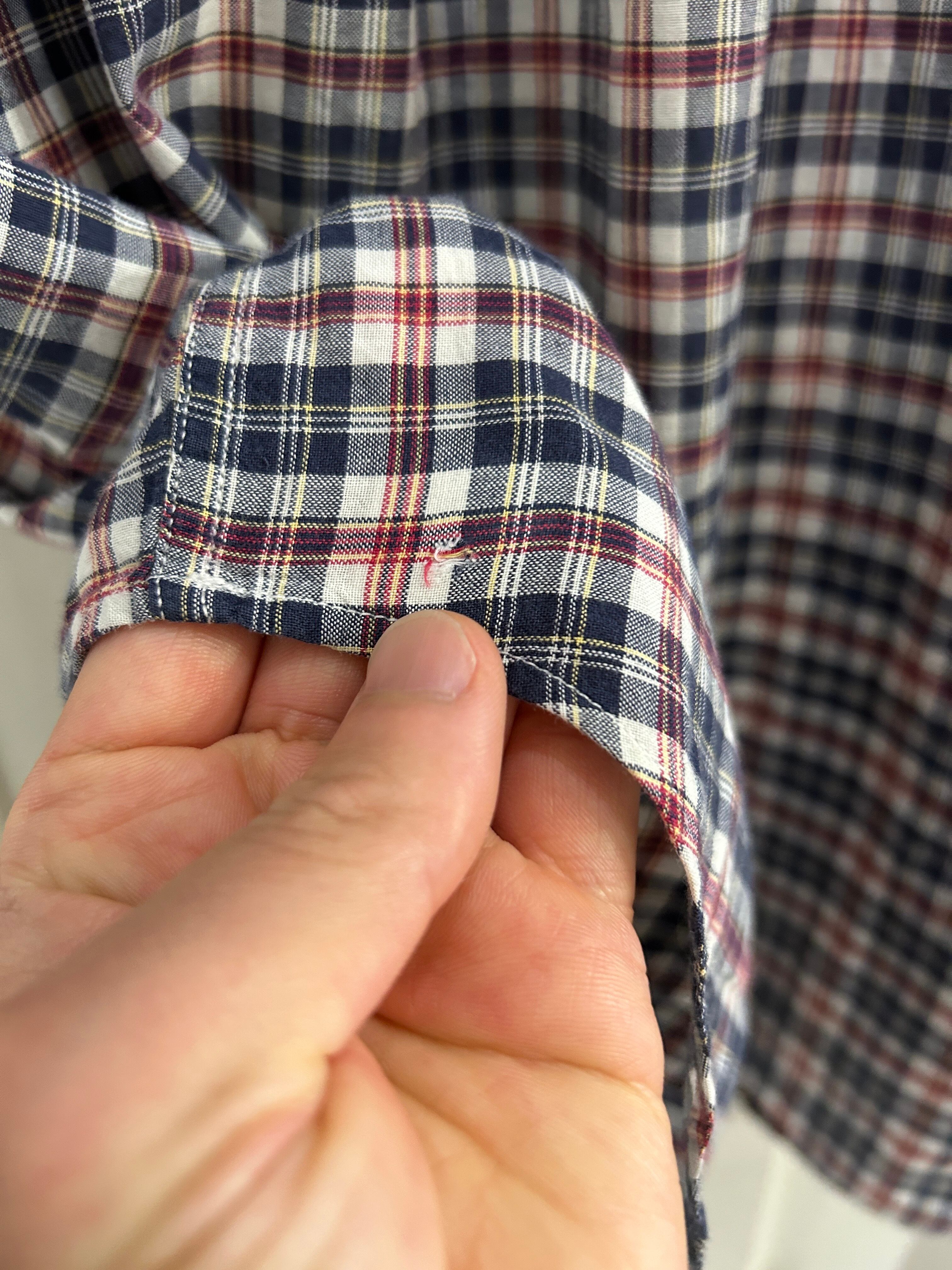 色味はネイビーとホワイトをベースにレッドとイエローが混ざるチェック柄。