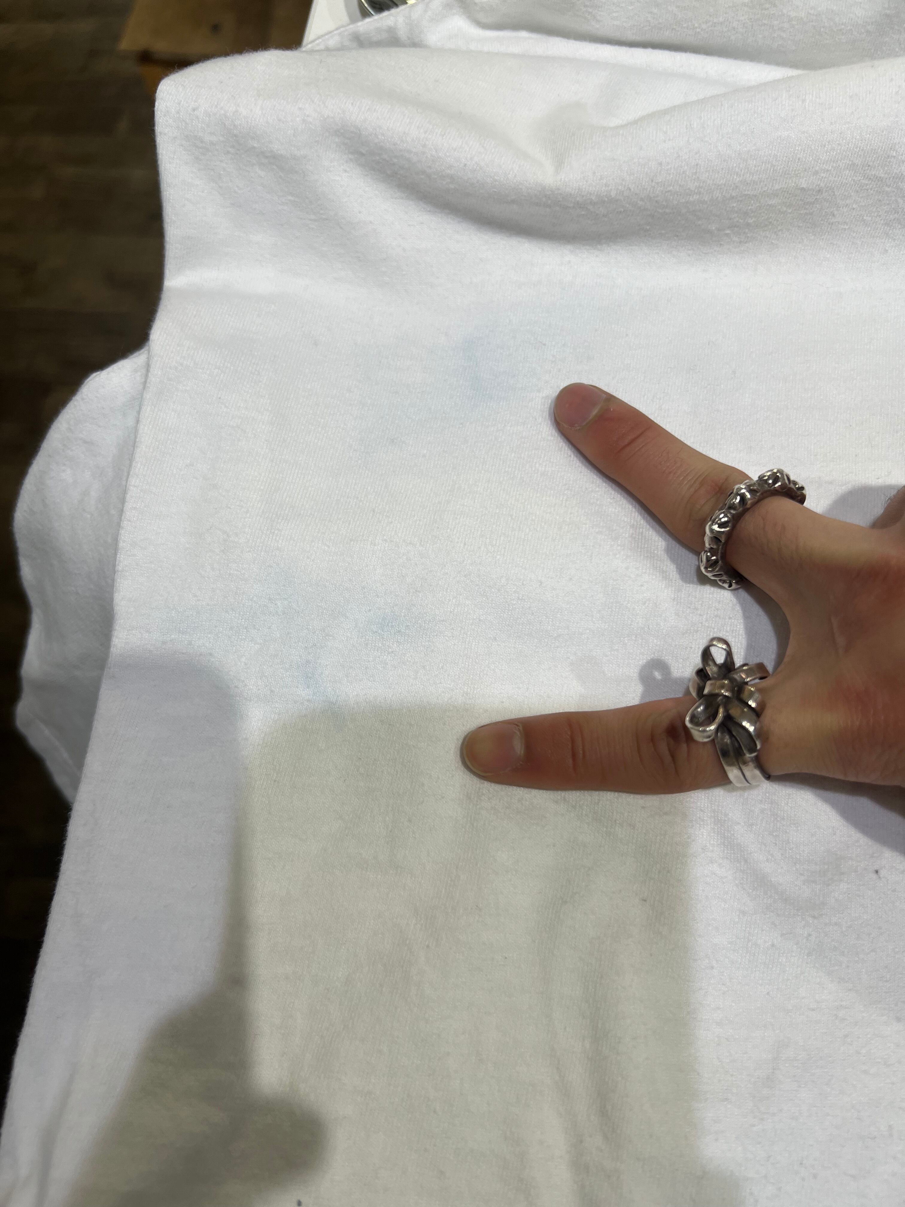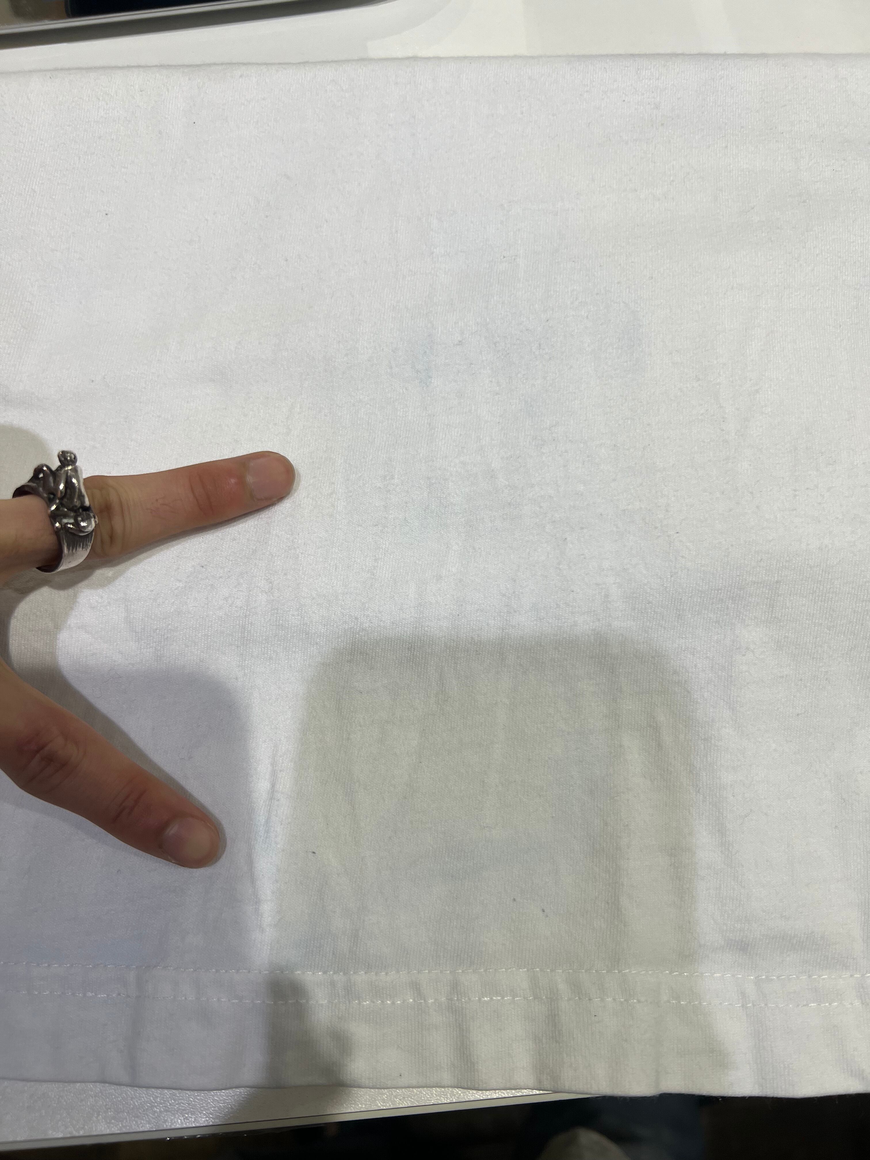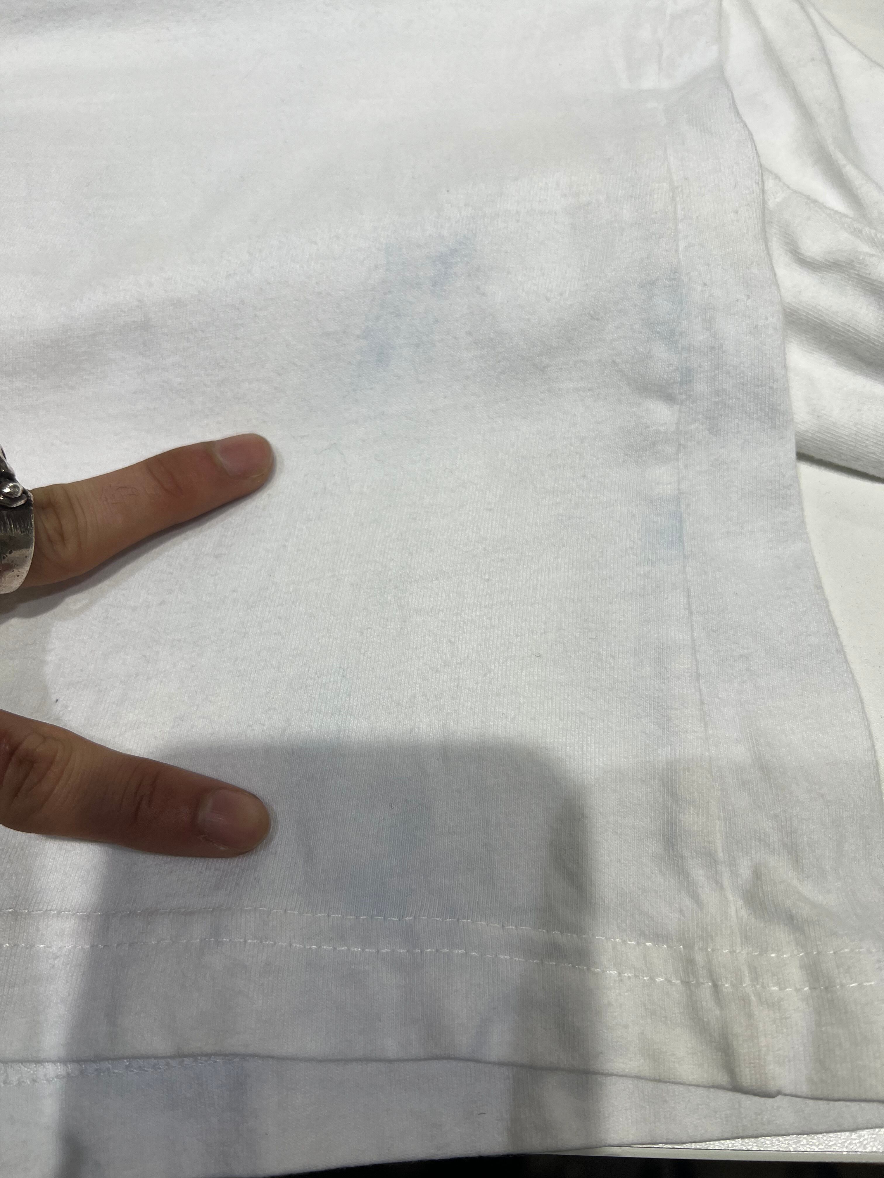 フロント右裾、左裾、右袖、背中側裾付近に目立たない程度の薄い色移りのようなものがあります。