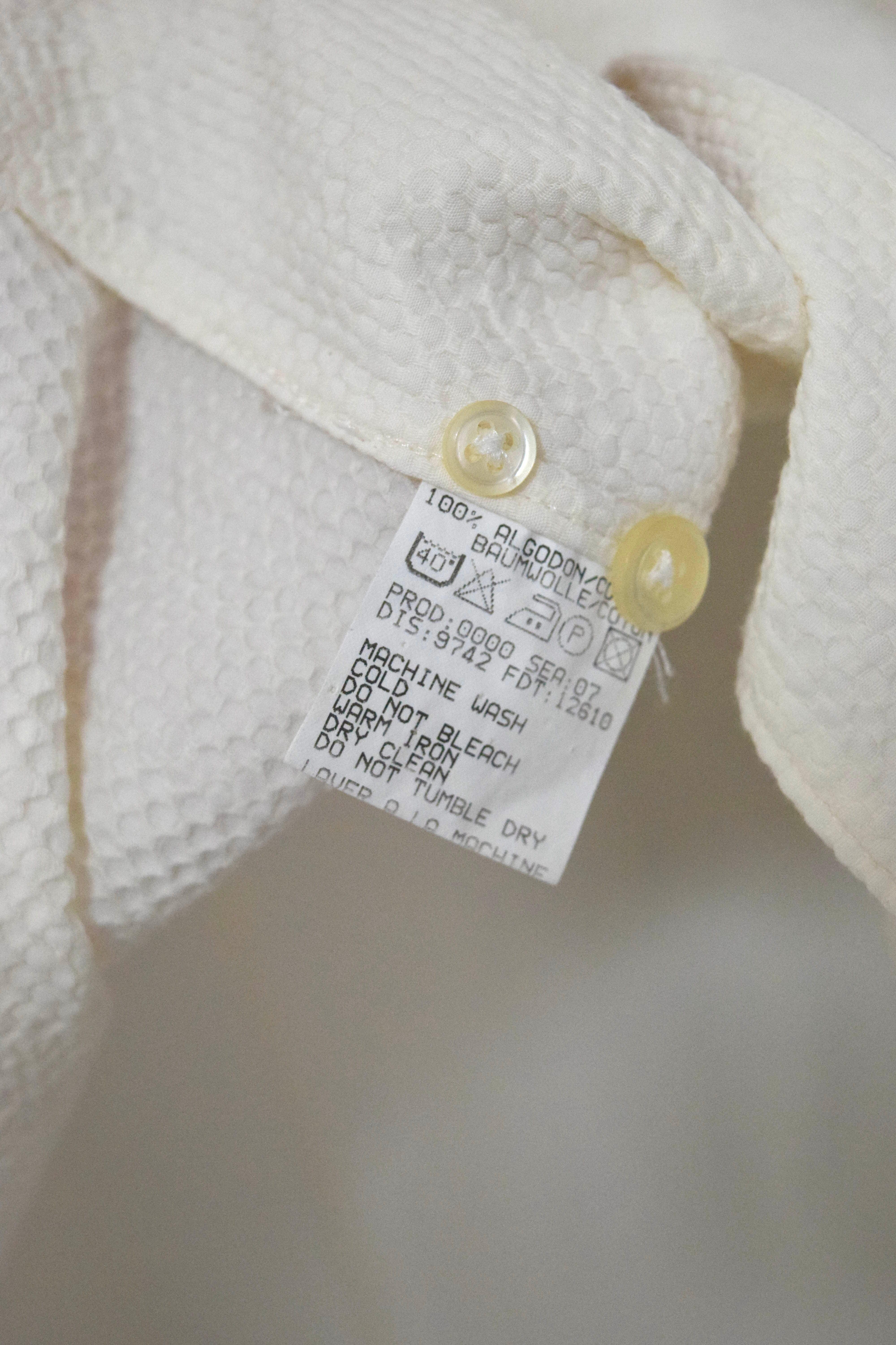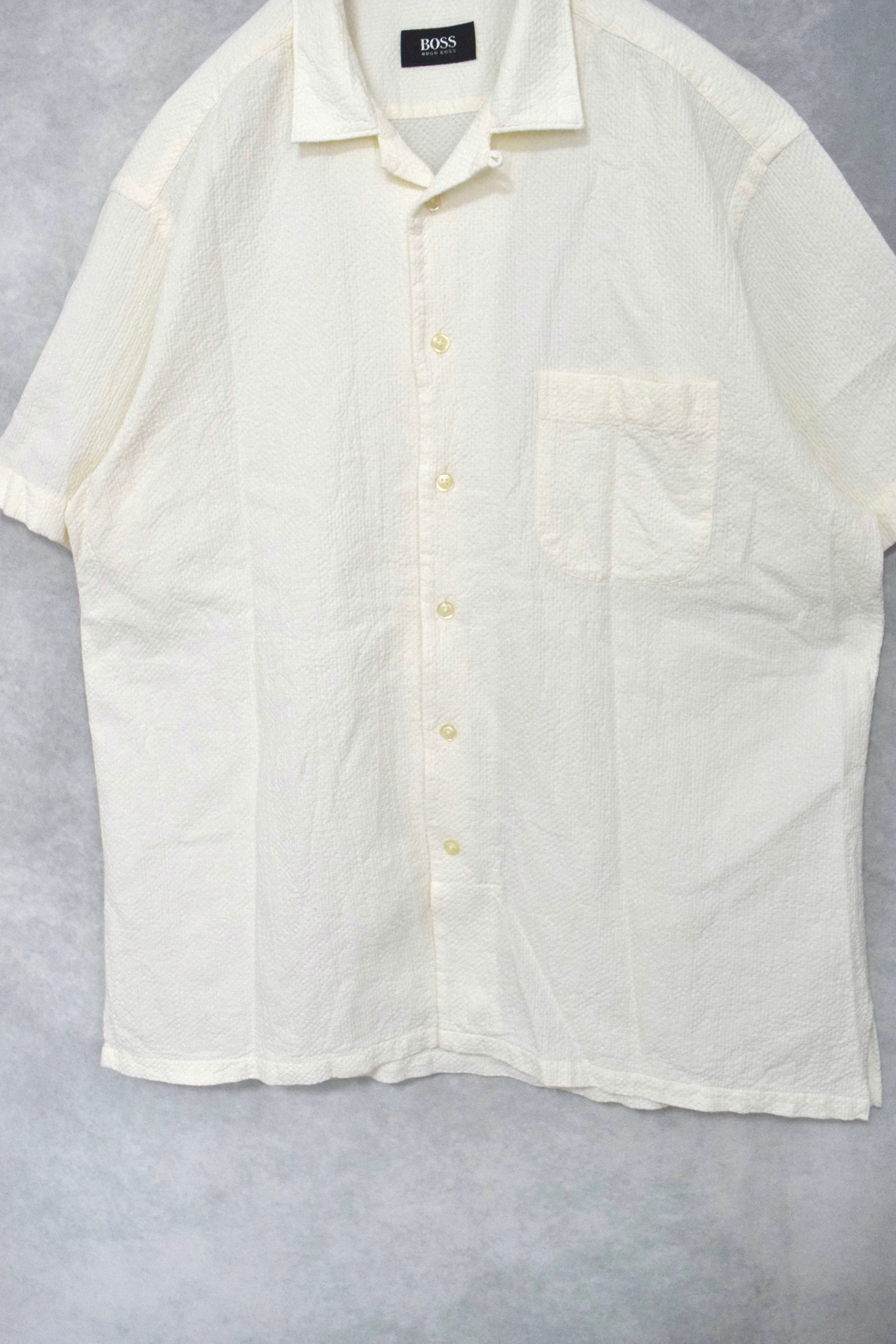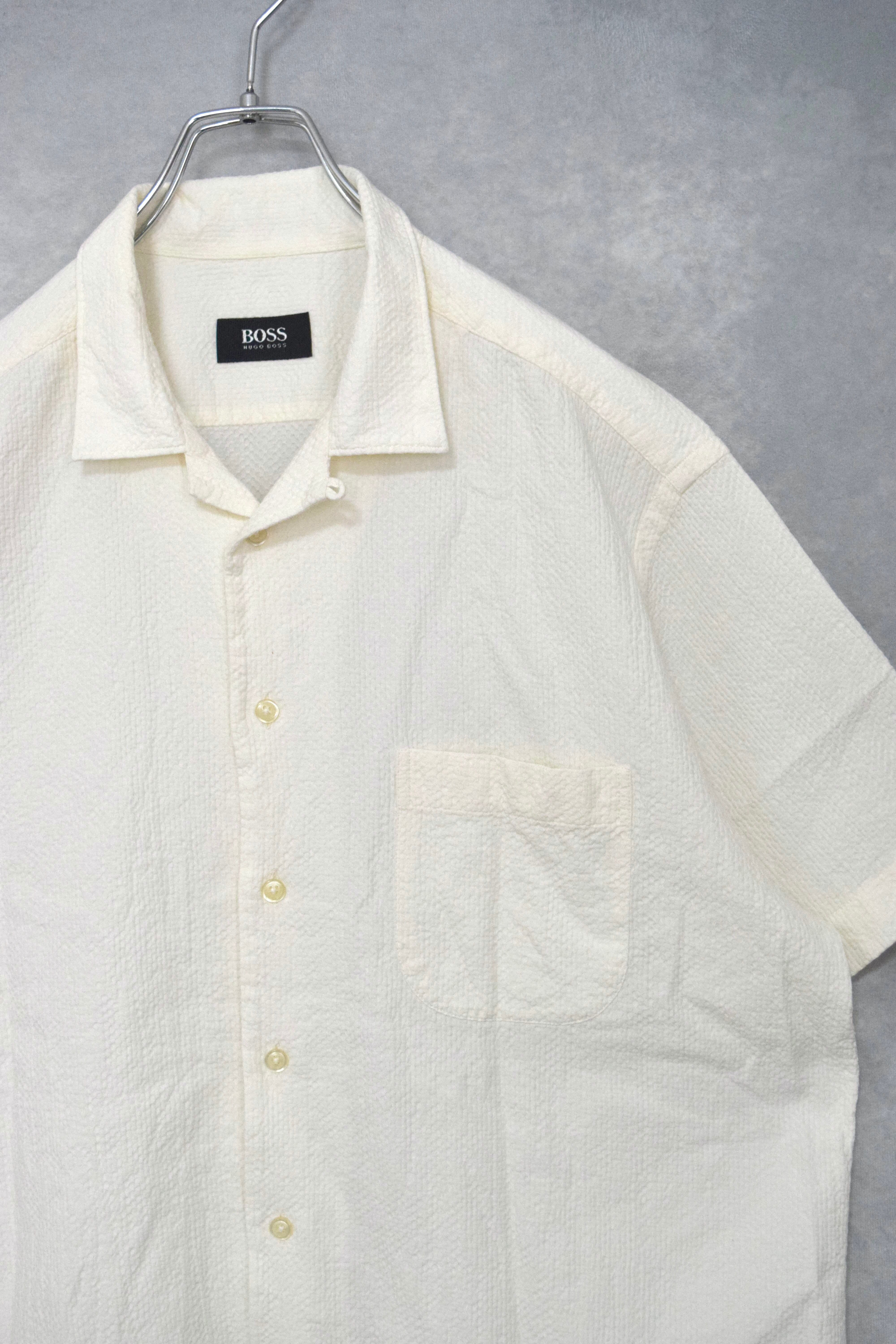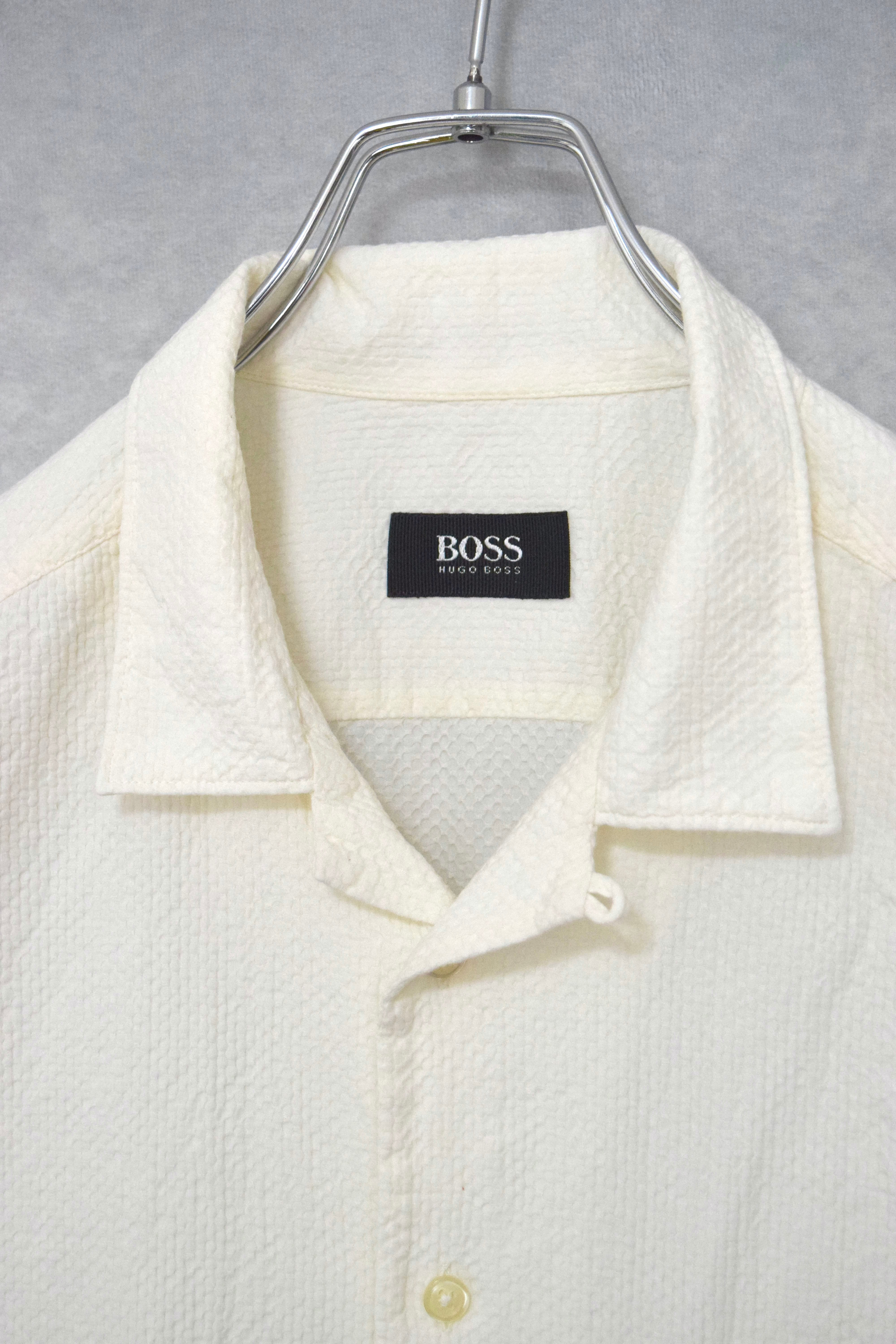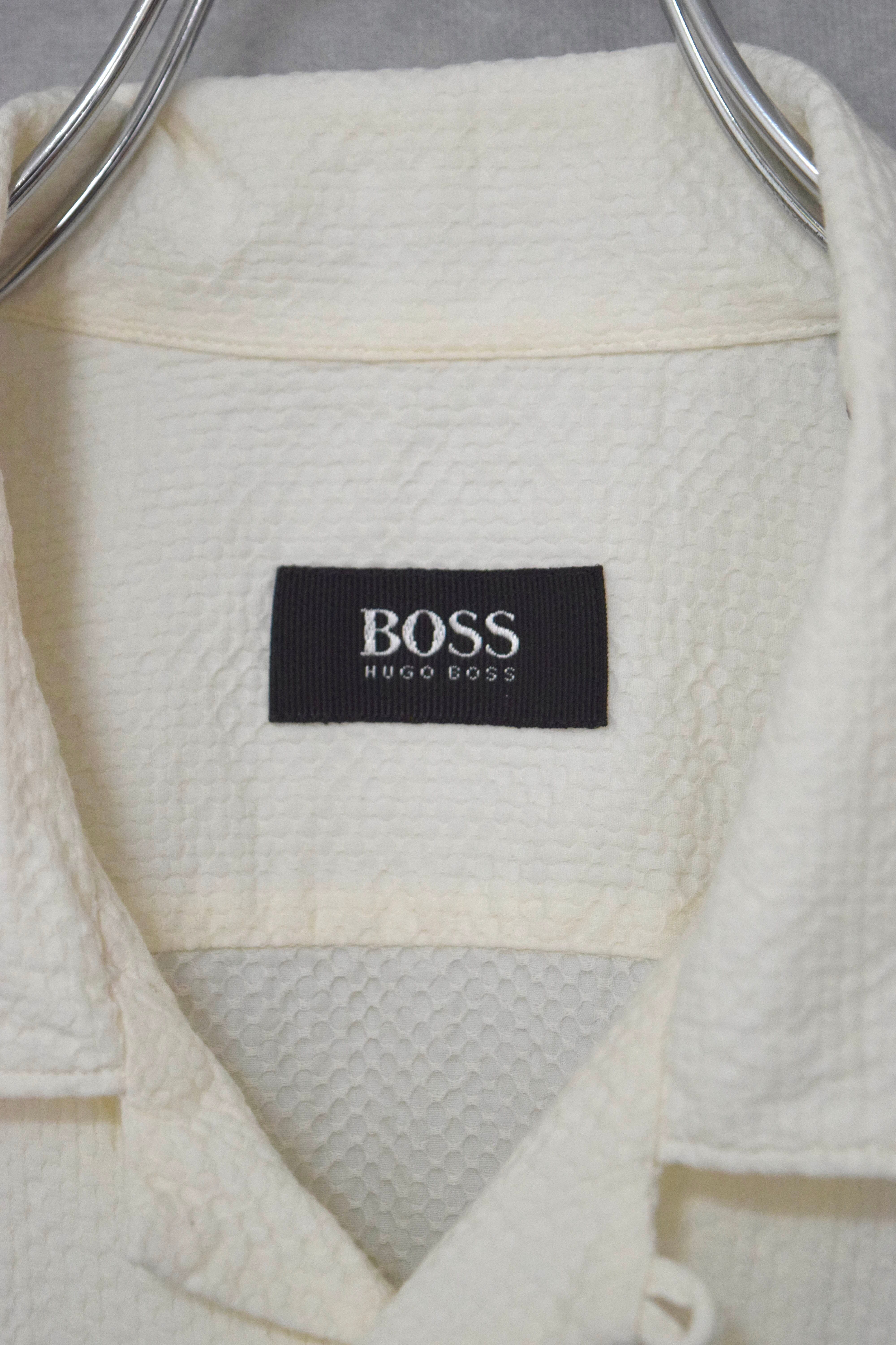 old " hugo boss " white seersucker open collar shirt / size ML