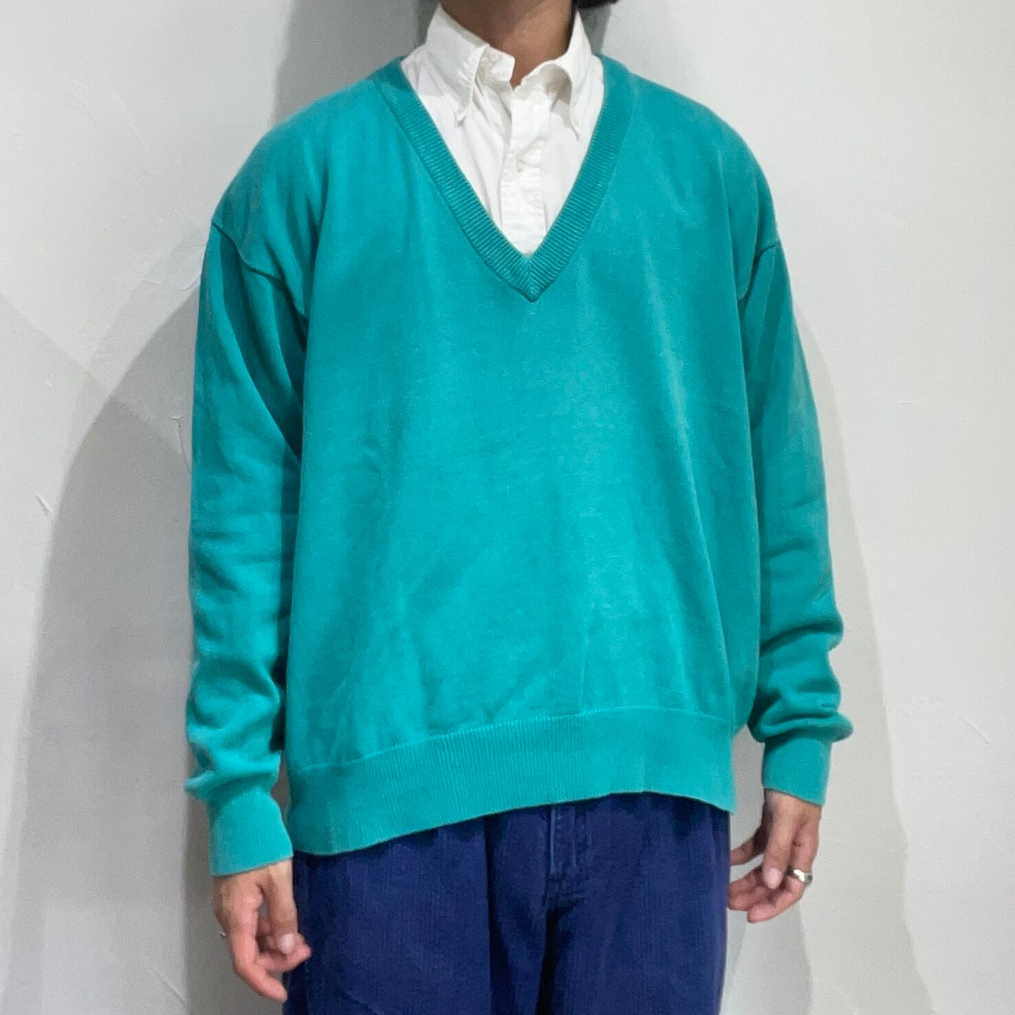 インナーありきのVネックニット、何と合わせるか考えるのが楽しい色味です。