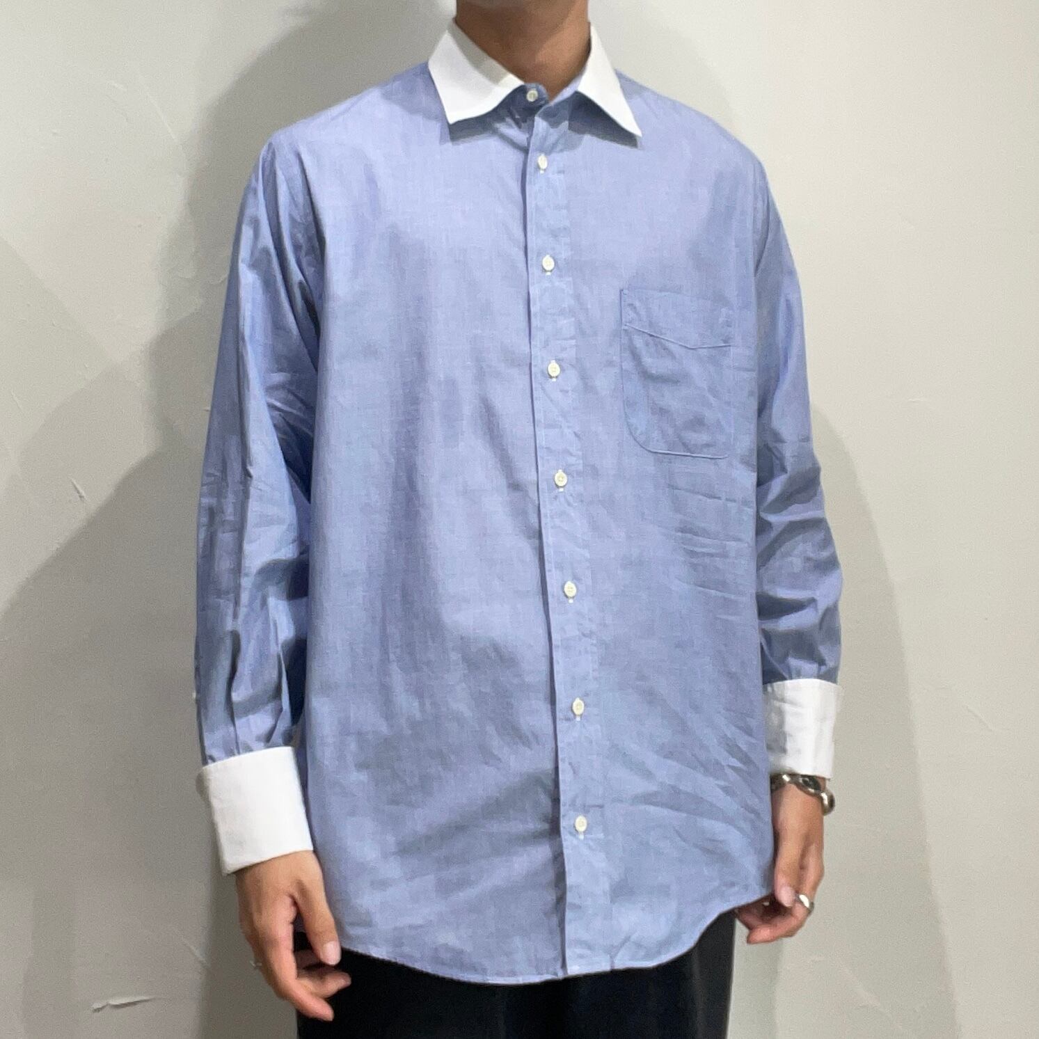 襟、袖のカフスが白無地の生地になっているクレリックシャツ。