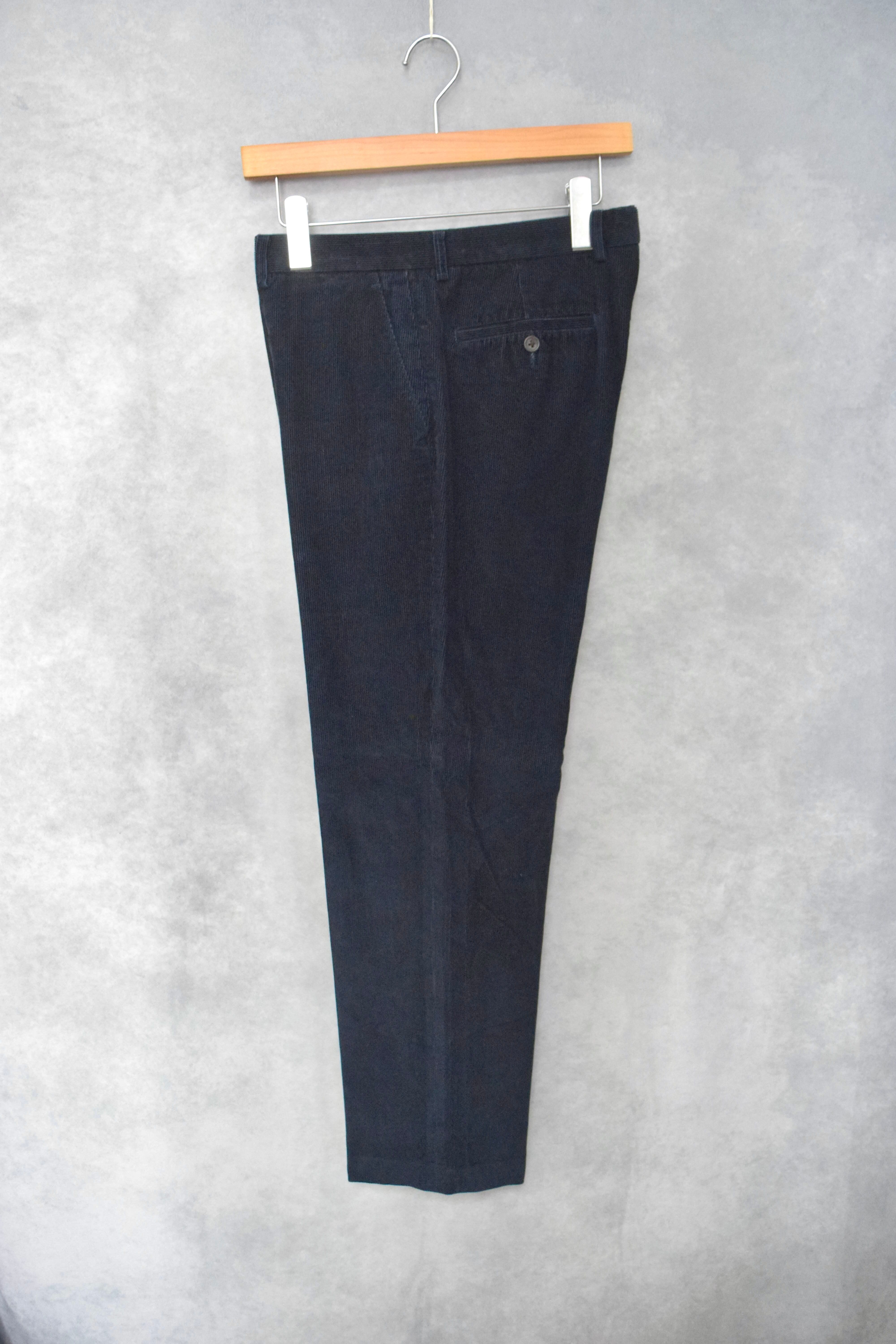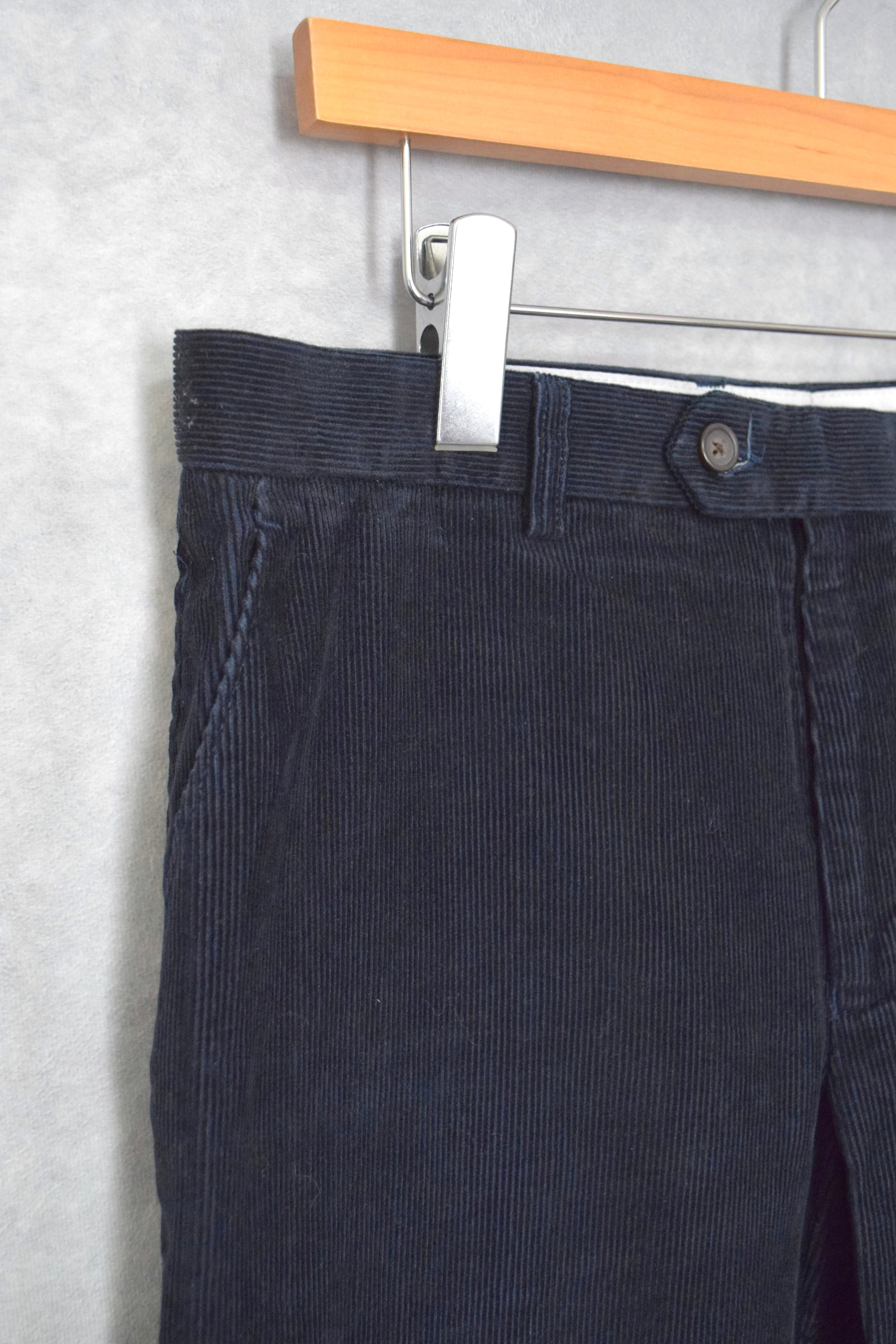 ダークネイビーカラーの細畝のコーデュロイ生地。