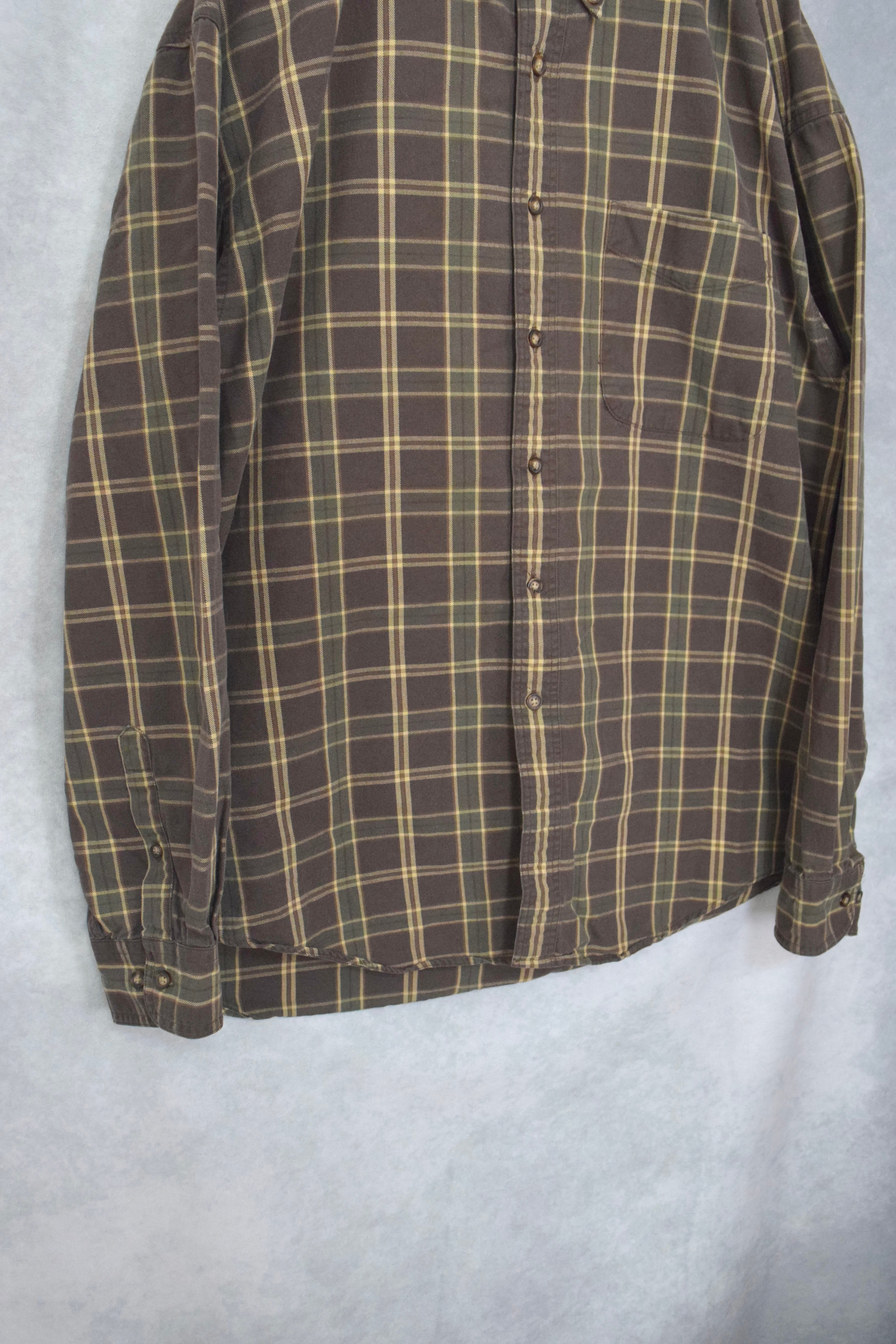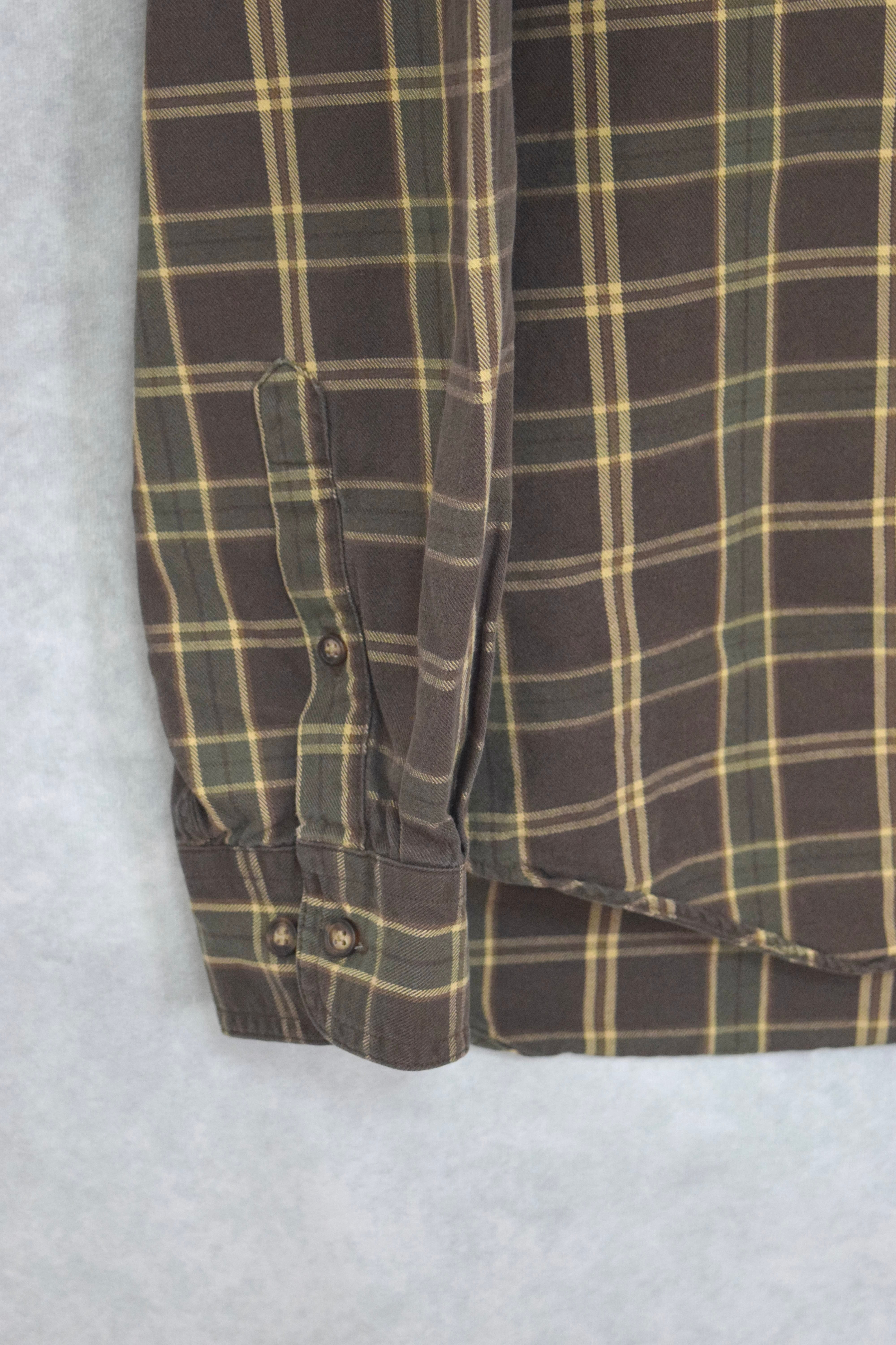 落ち着いた風合いのブラウンをベースに入るベージュとオリーブのチェックパターン。