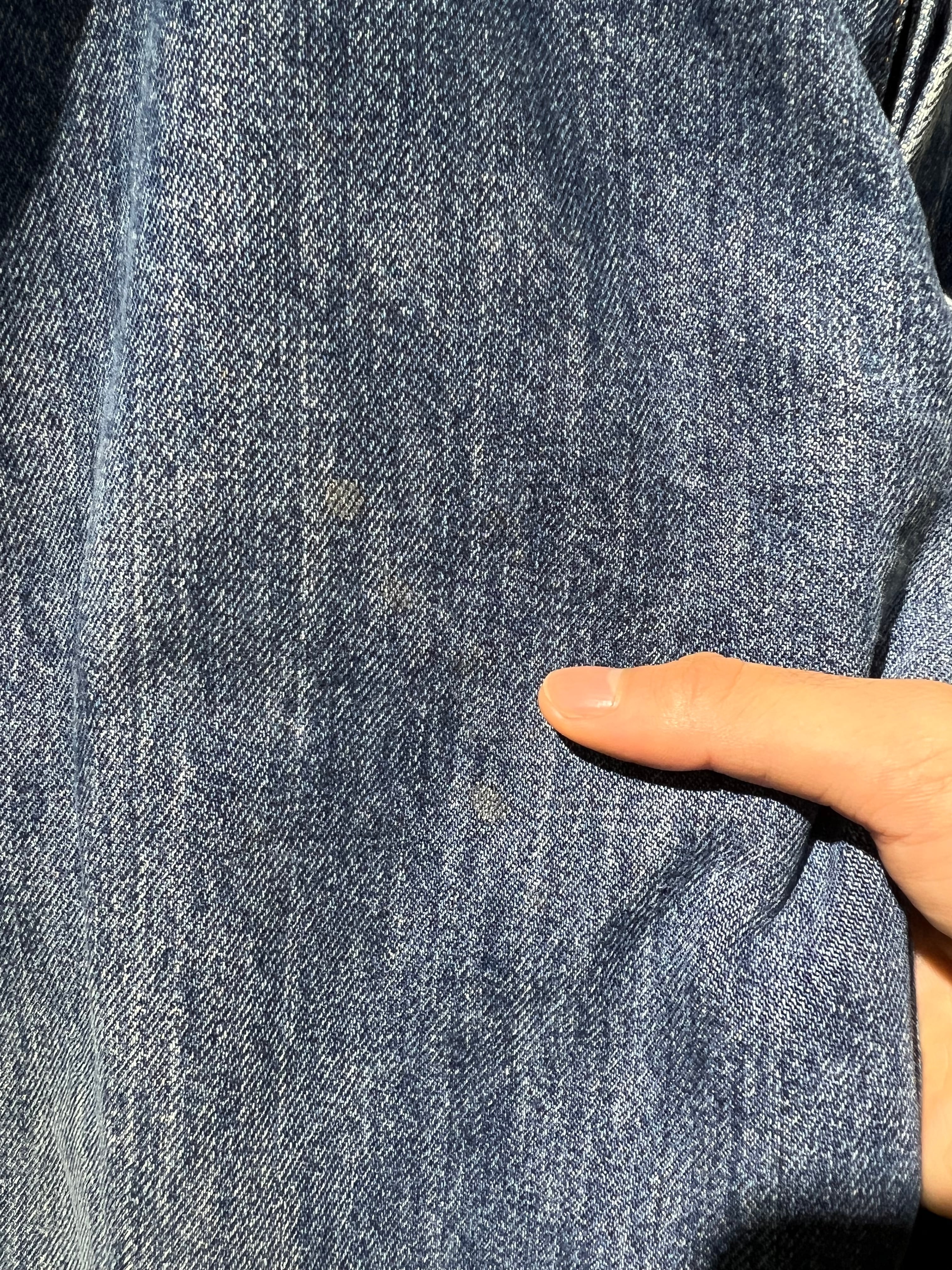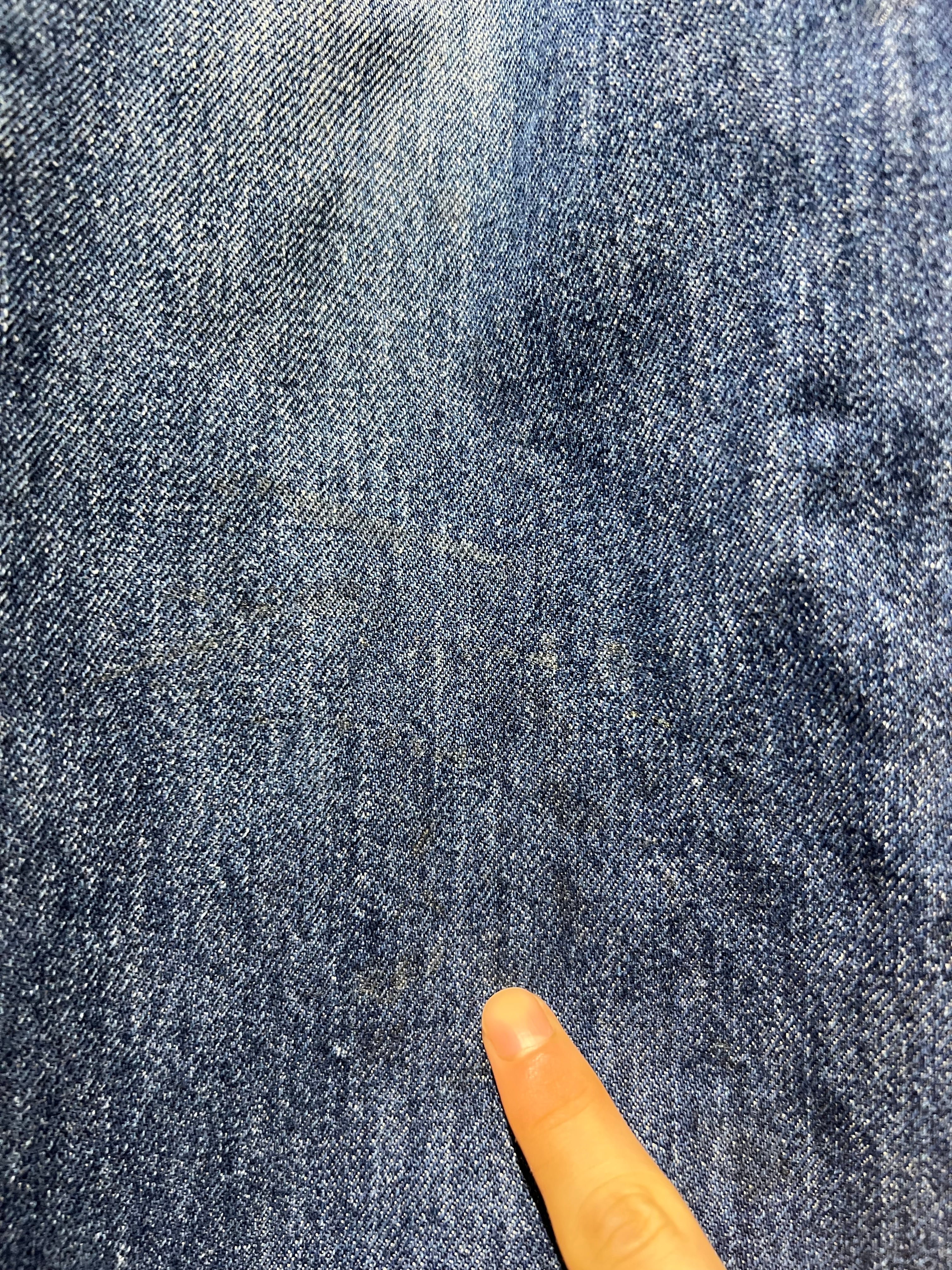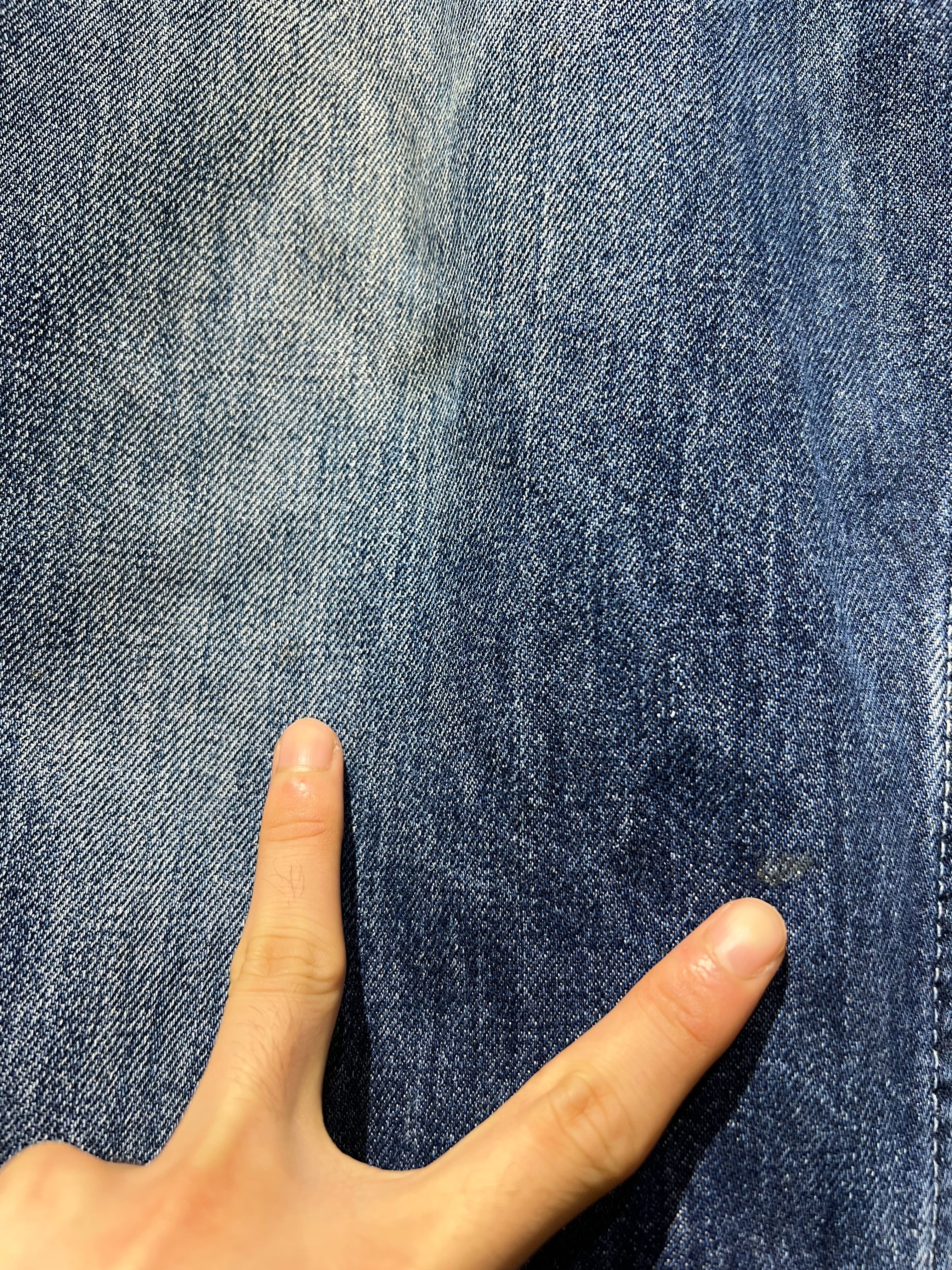 両腿辺り、左後ろポケット、右裾付近に薄い汚れがあります。