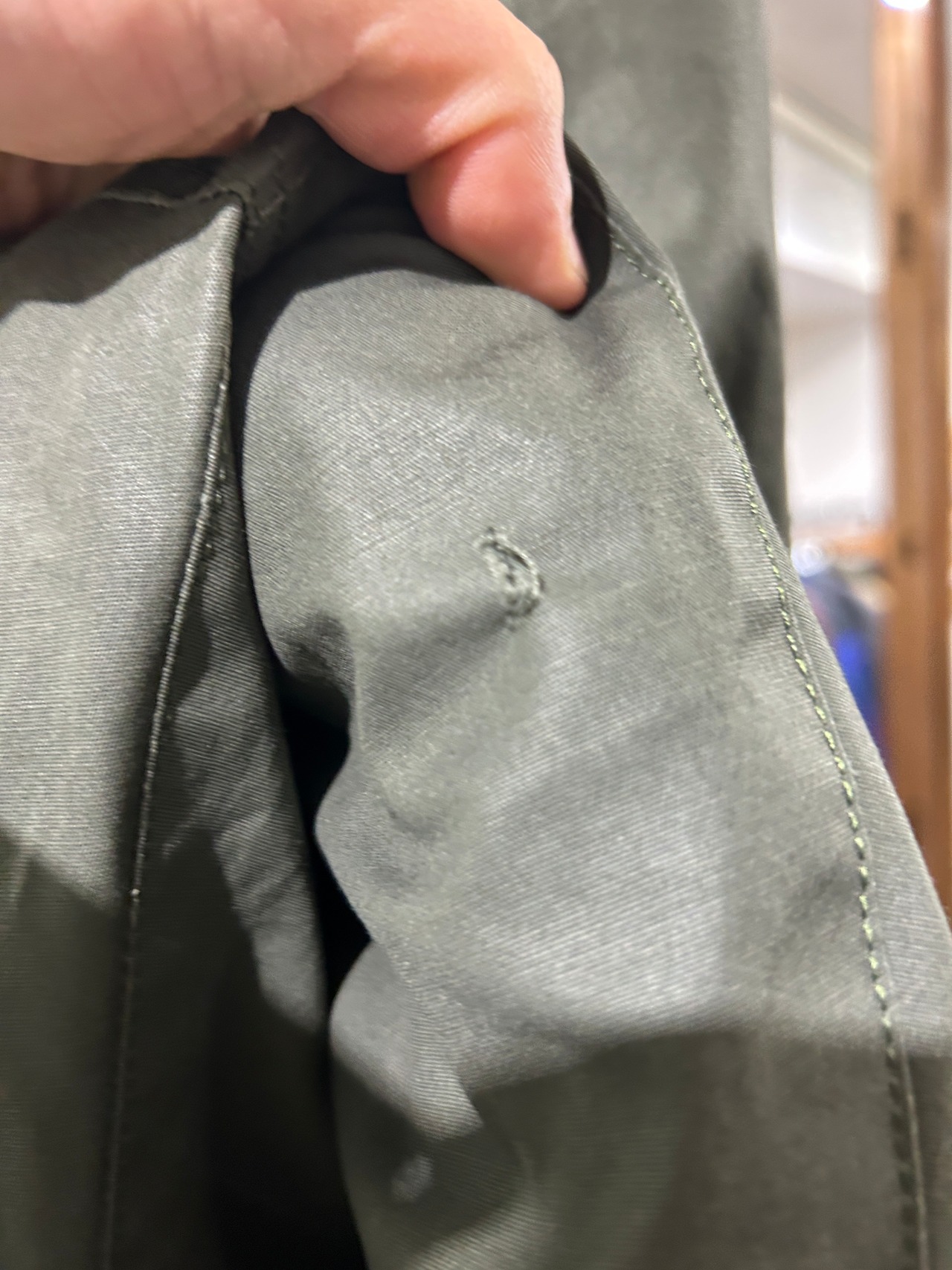 左脇下付近に1cm程の裂けがありますが裏地がついているため貫通していません。