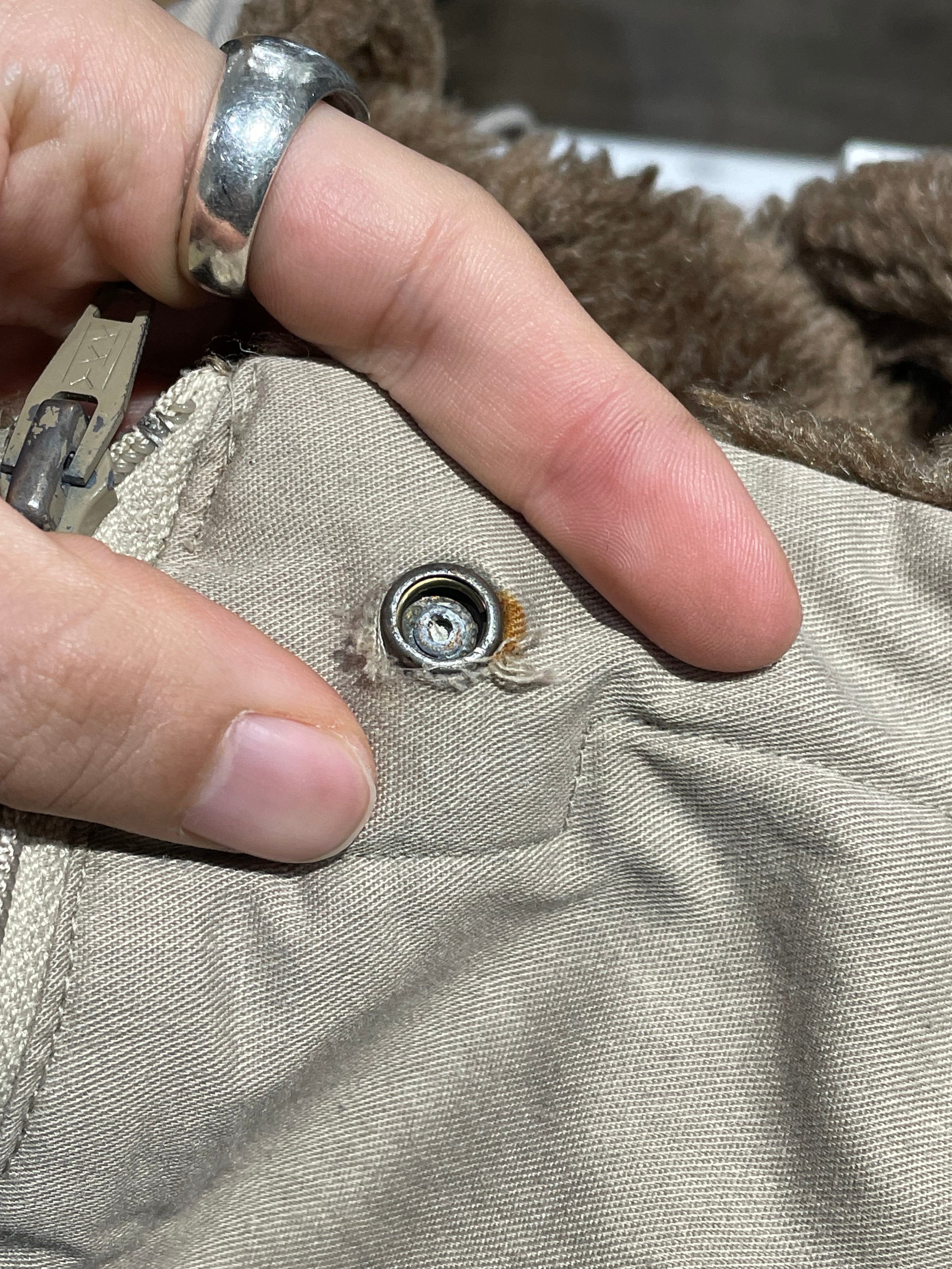 前面右裾ポケ付近、背面下部に若干の小穴がありますが、年代を考慮すると比較的綺麗なコンディションかと思います。