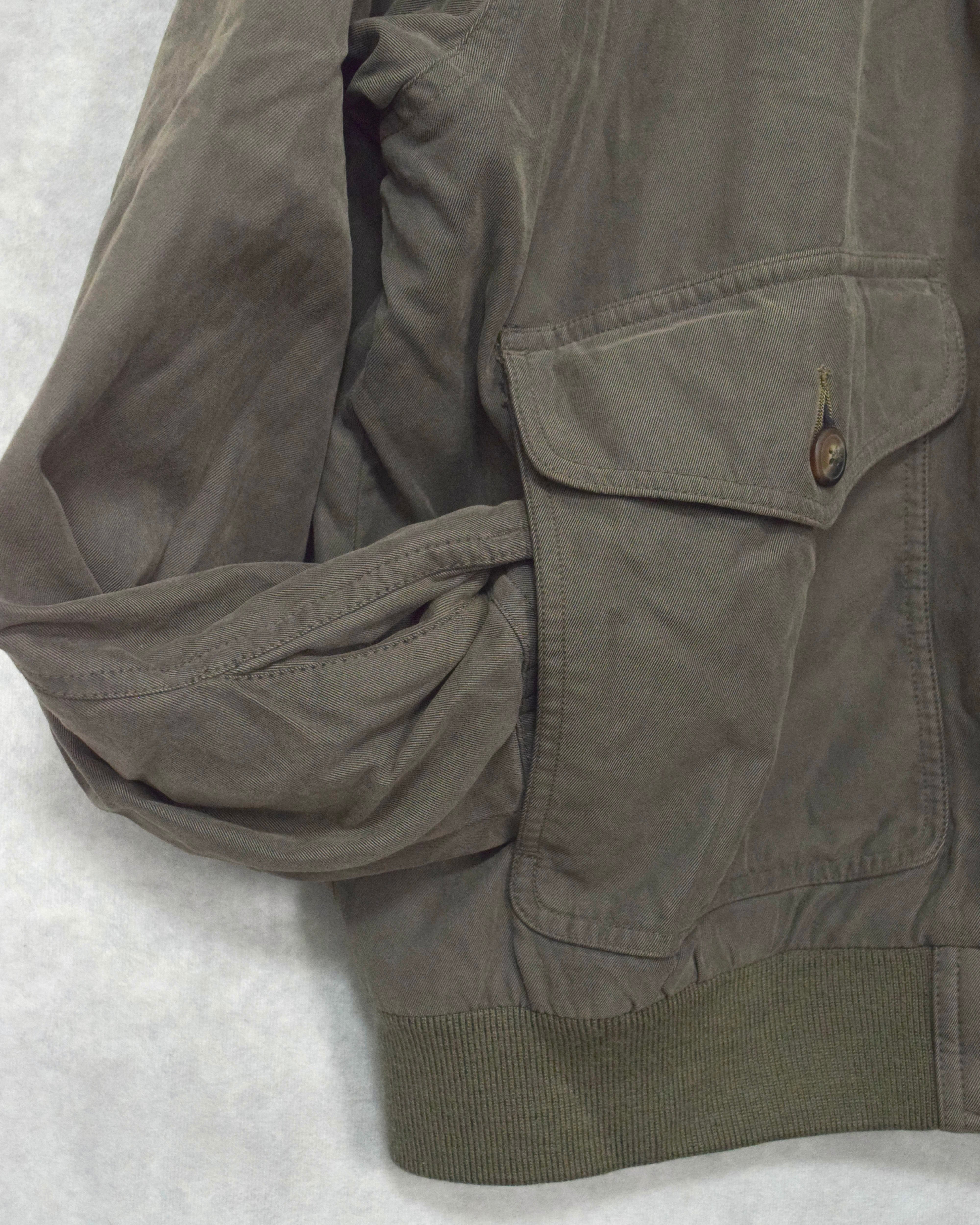 アメリカンミリタリーの代表格の1つのA2フライトジャケットを当年代に流行していたスムースファブリックを使用してサンプリングされたこちら。