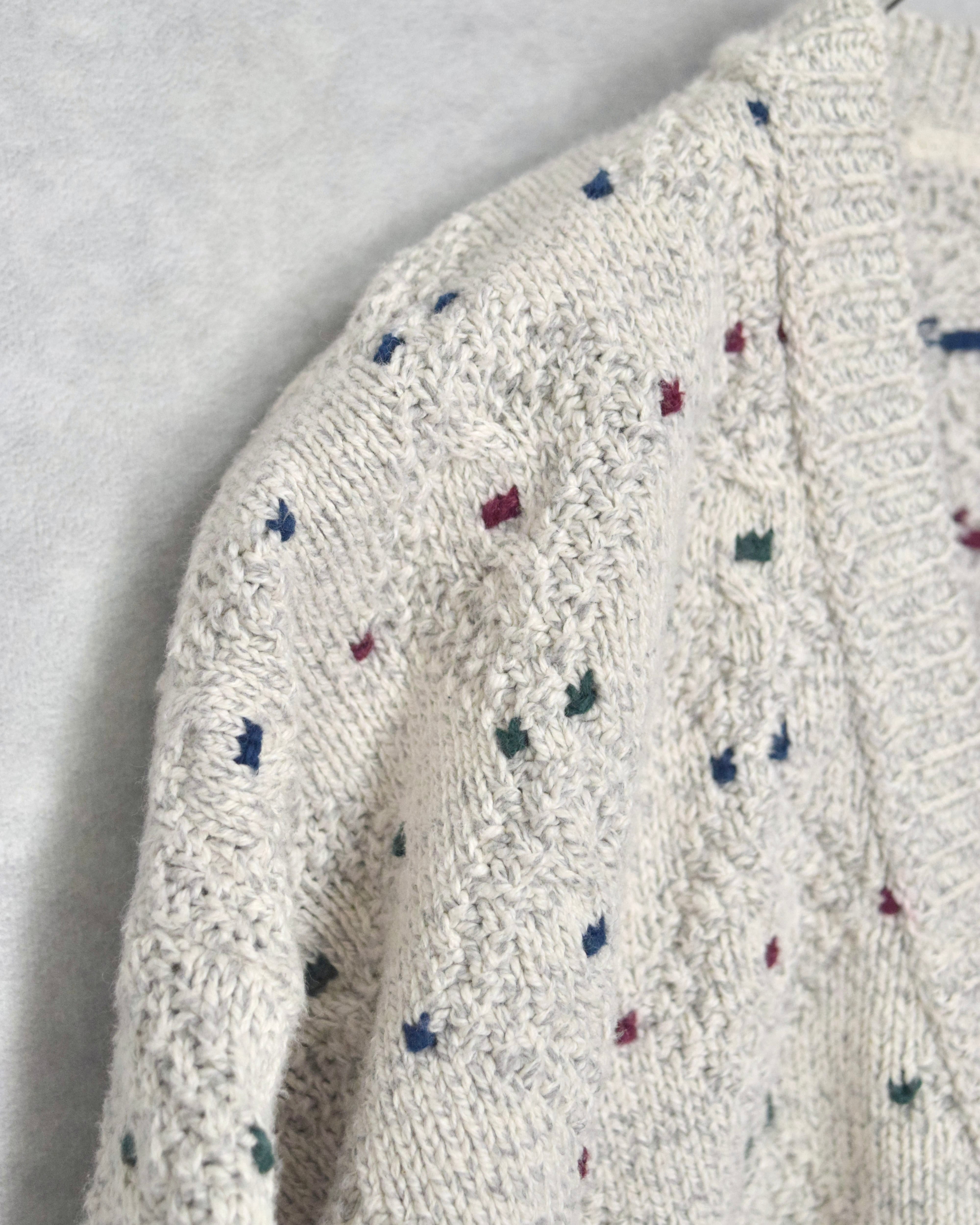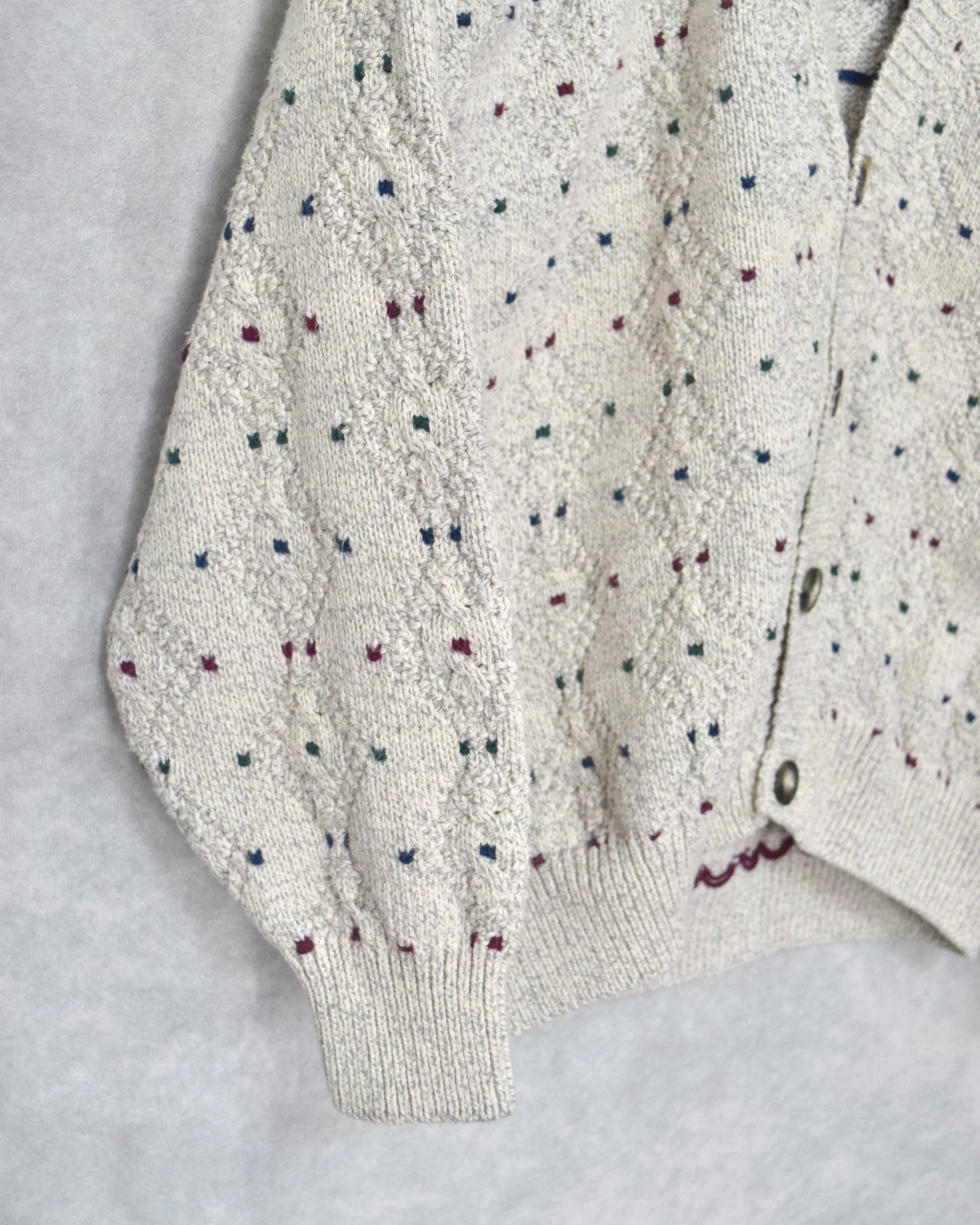 オフホワイトをベースにワインレッド、ネイビー、フォレストグリーンで構成されたドットのような編み柄。