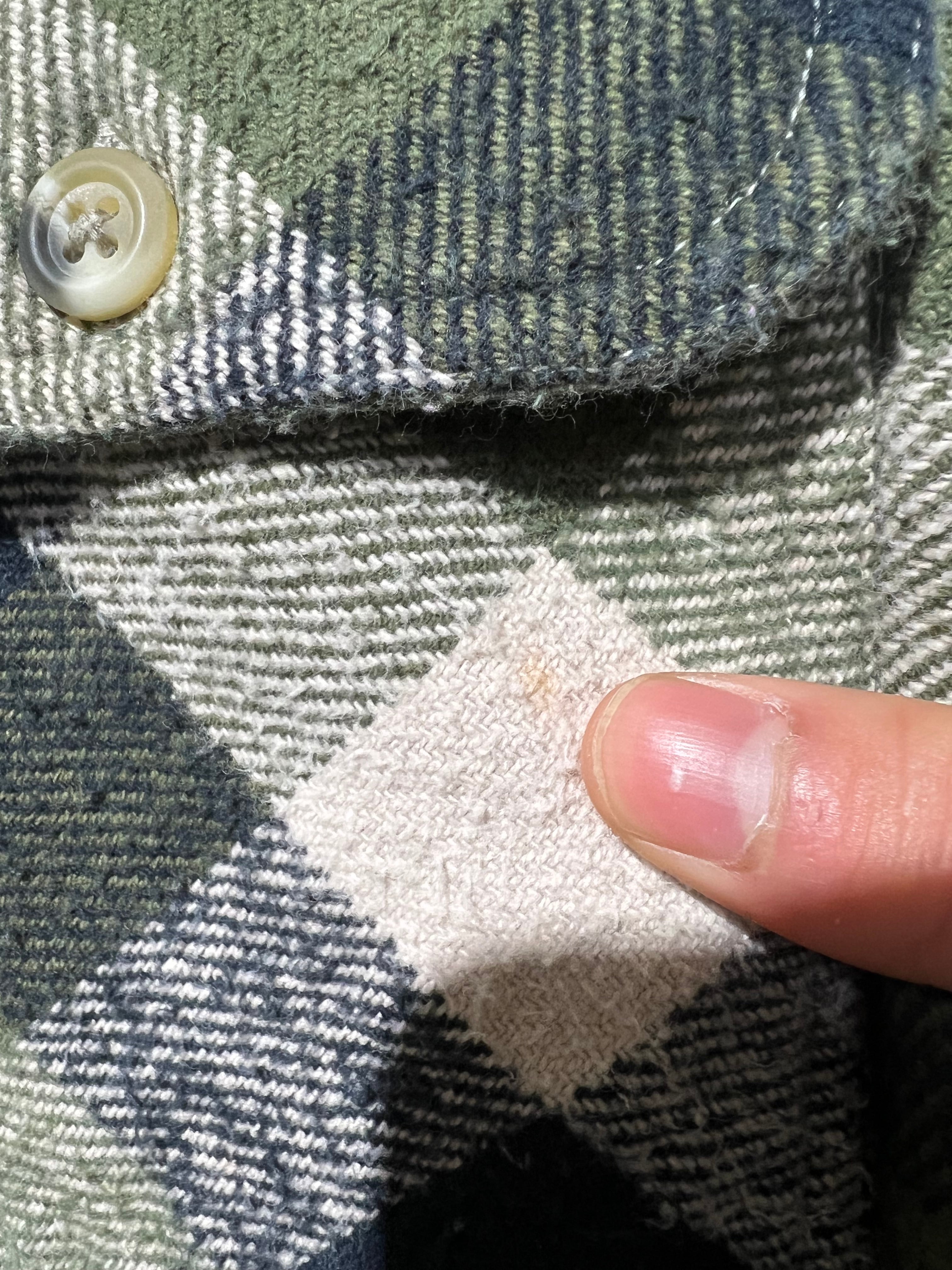 左胸ポケット、前裾先、襟内側に小さな薄いシミがあります。