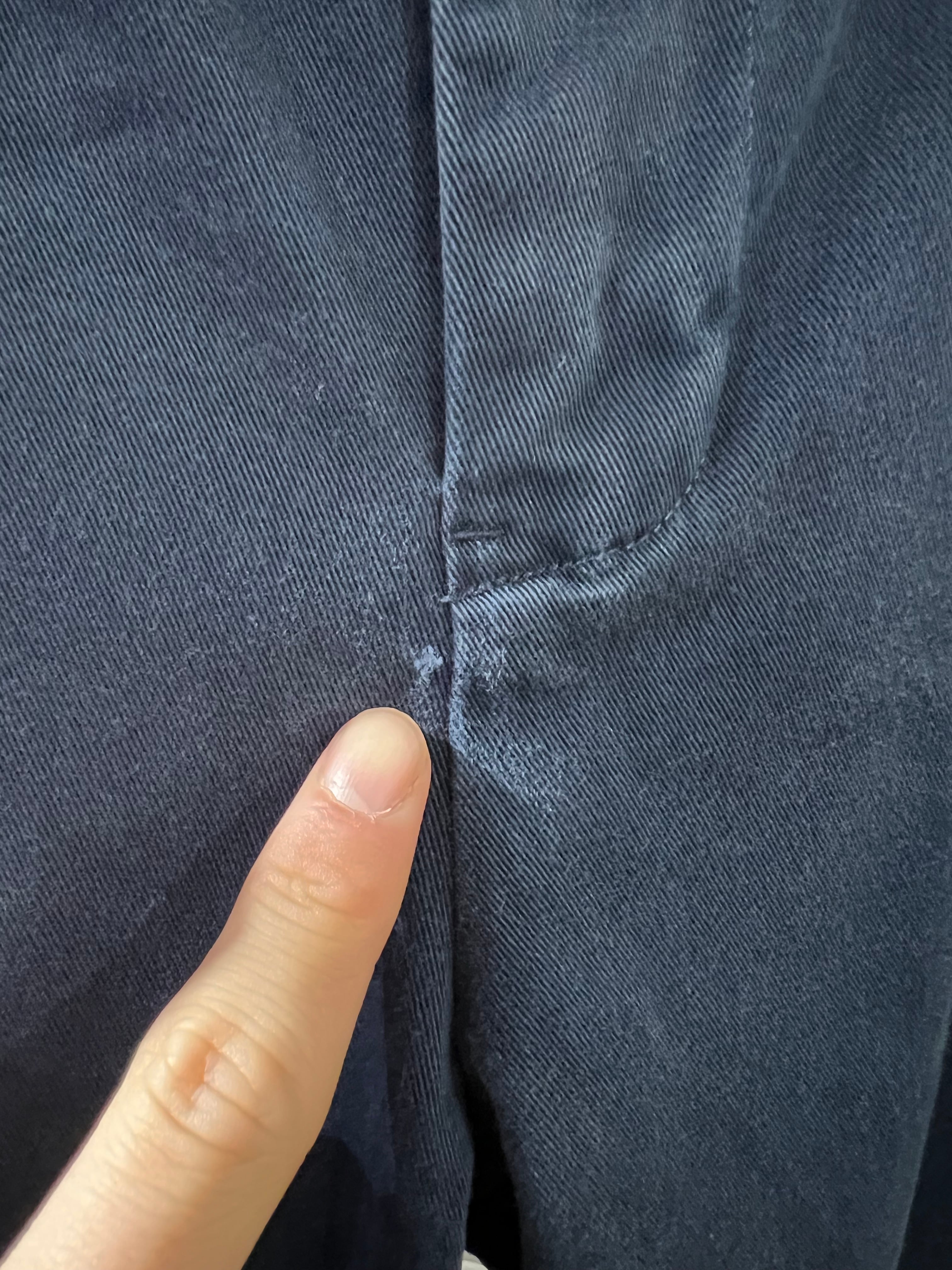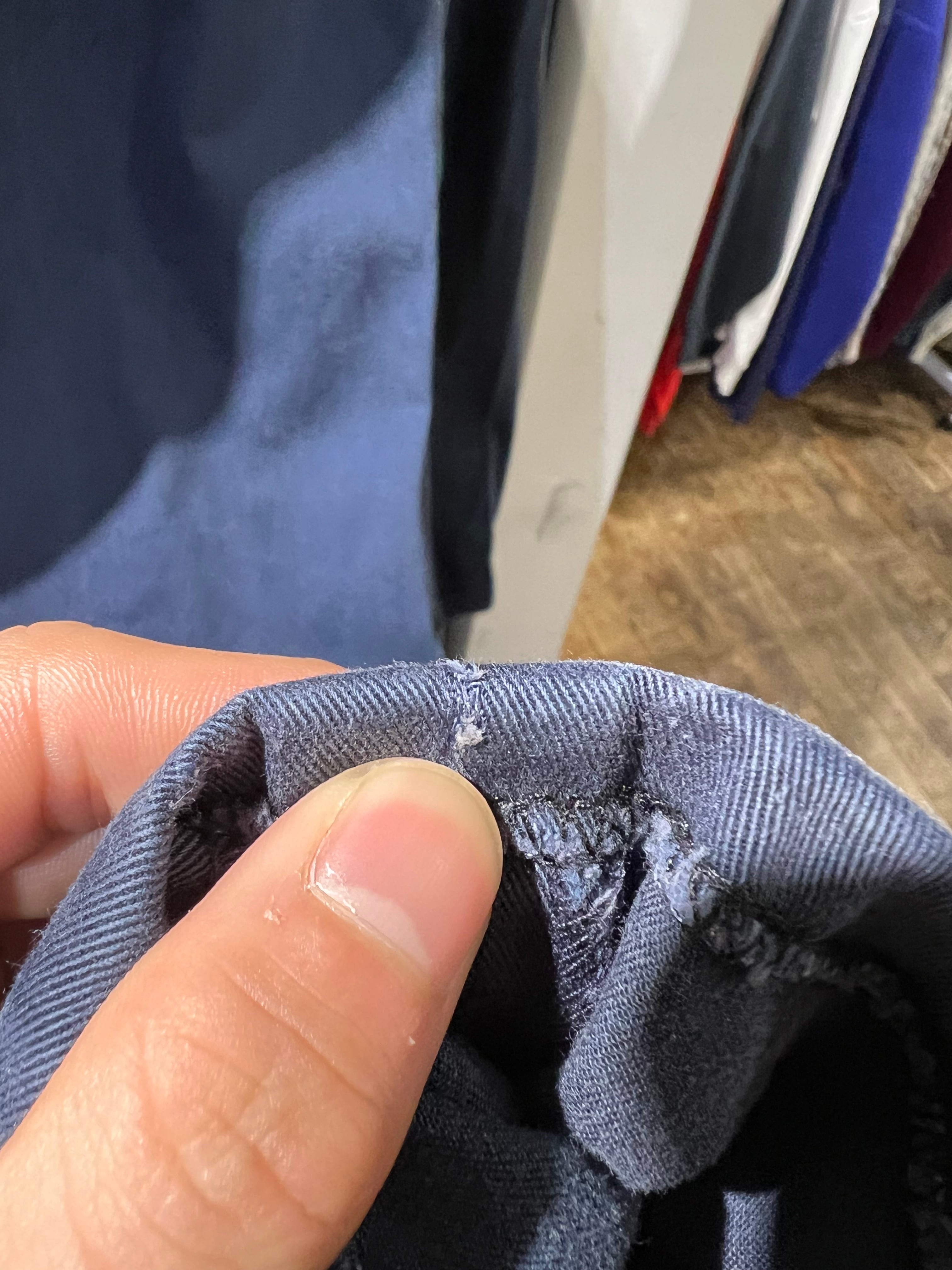 フロントジップライン下部、右裾に小さな糸スレがありますが貫通しておらずご着用には問題ありません。