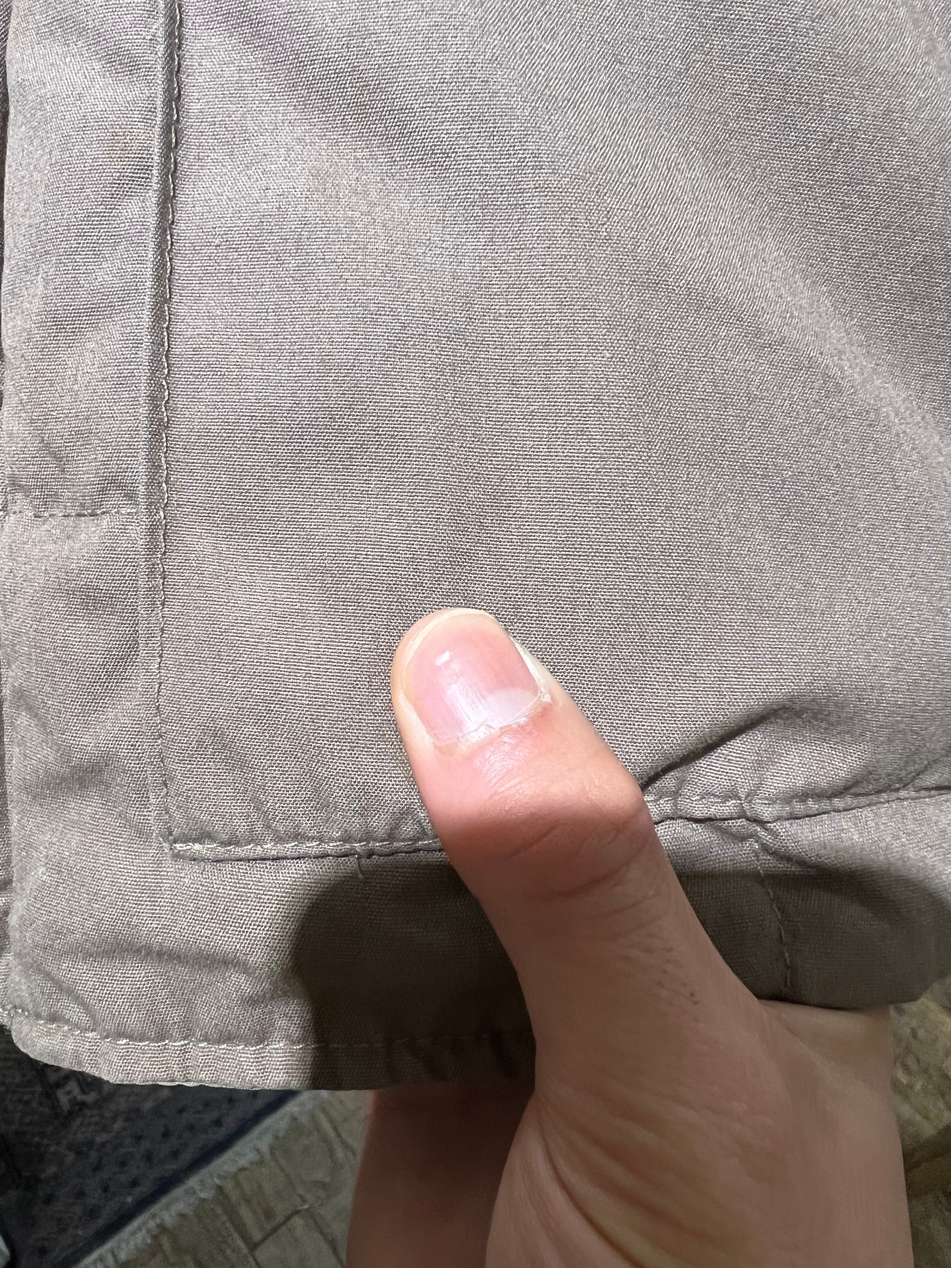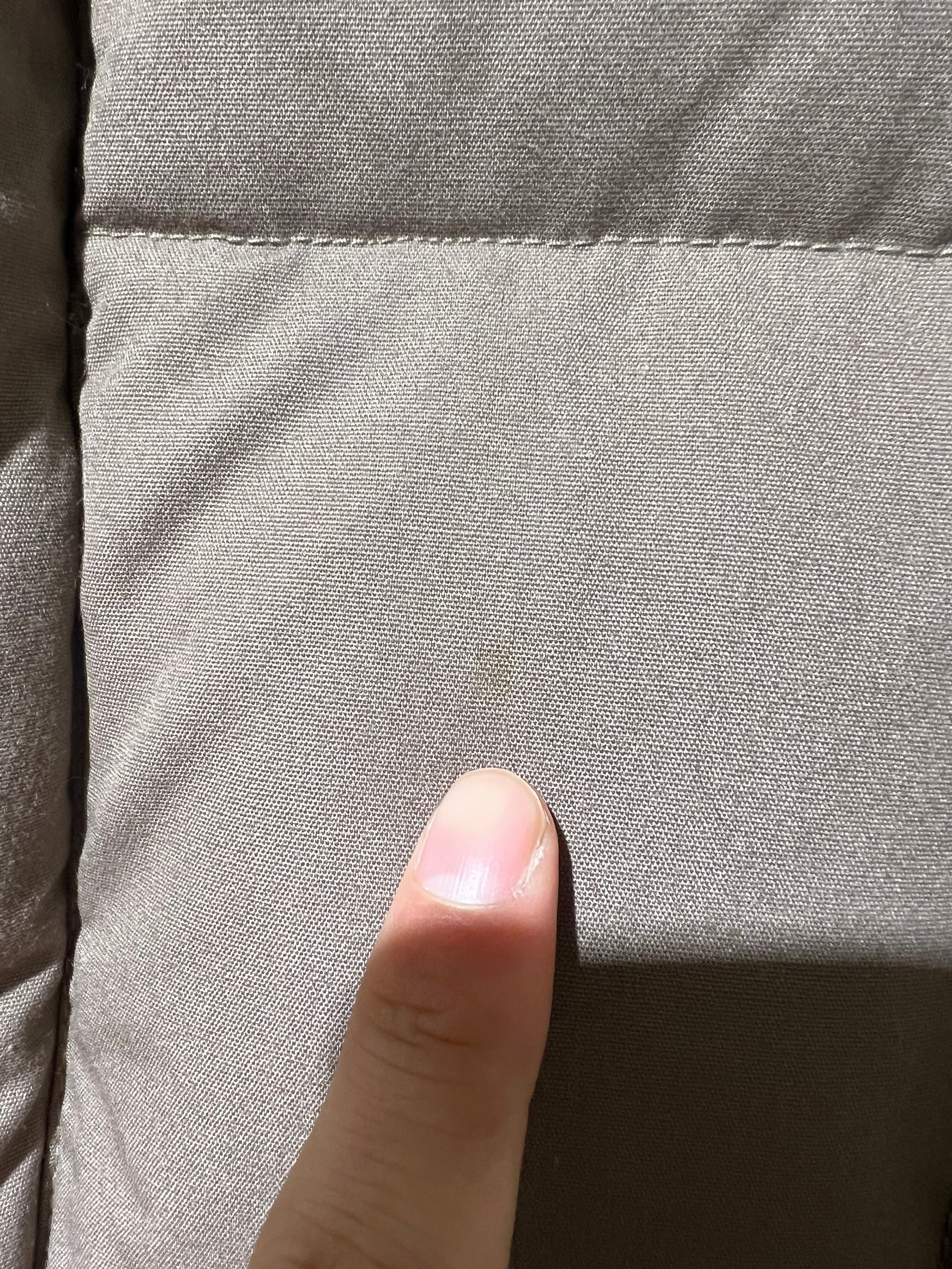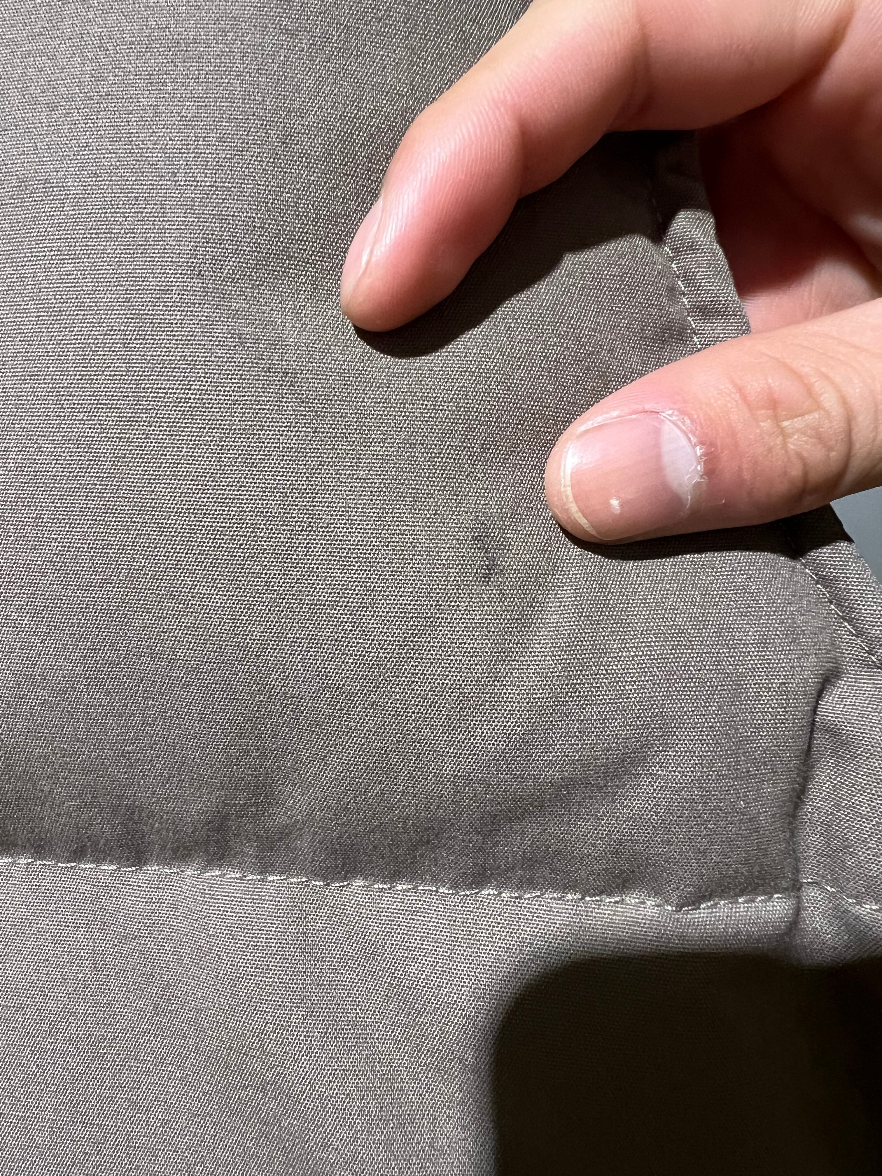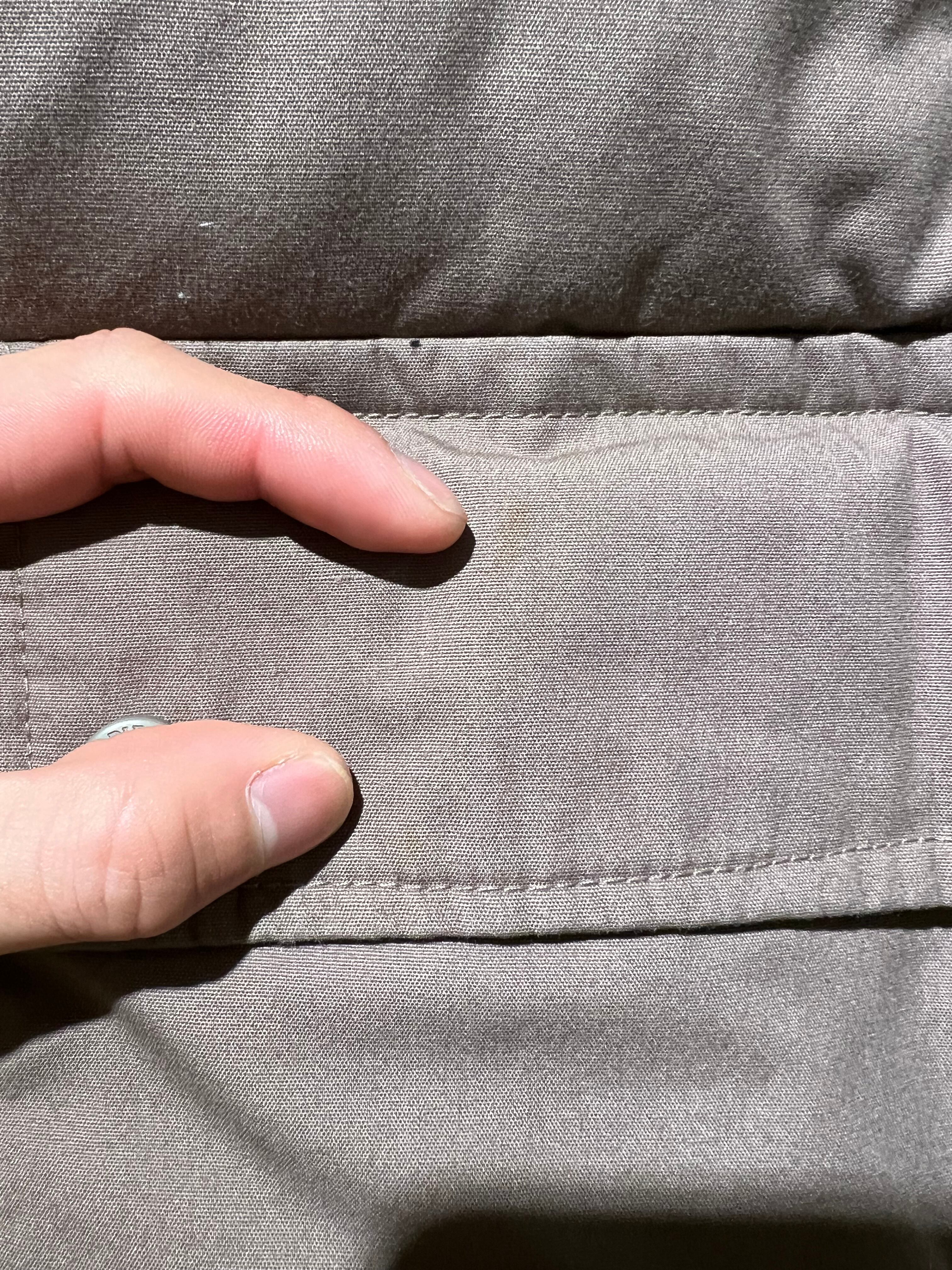左胸、右ポケット、前裾にかなり薄いシミがあります。
