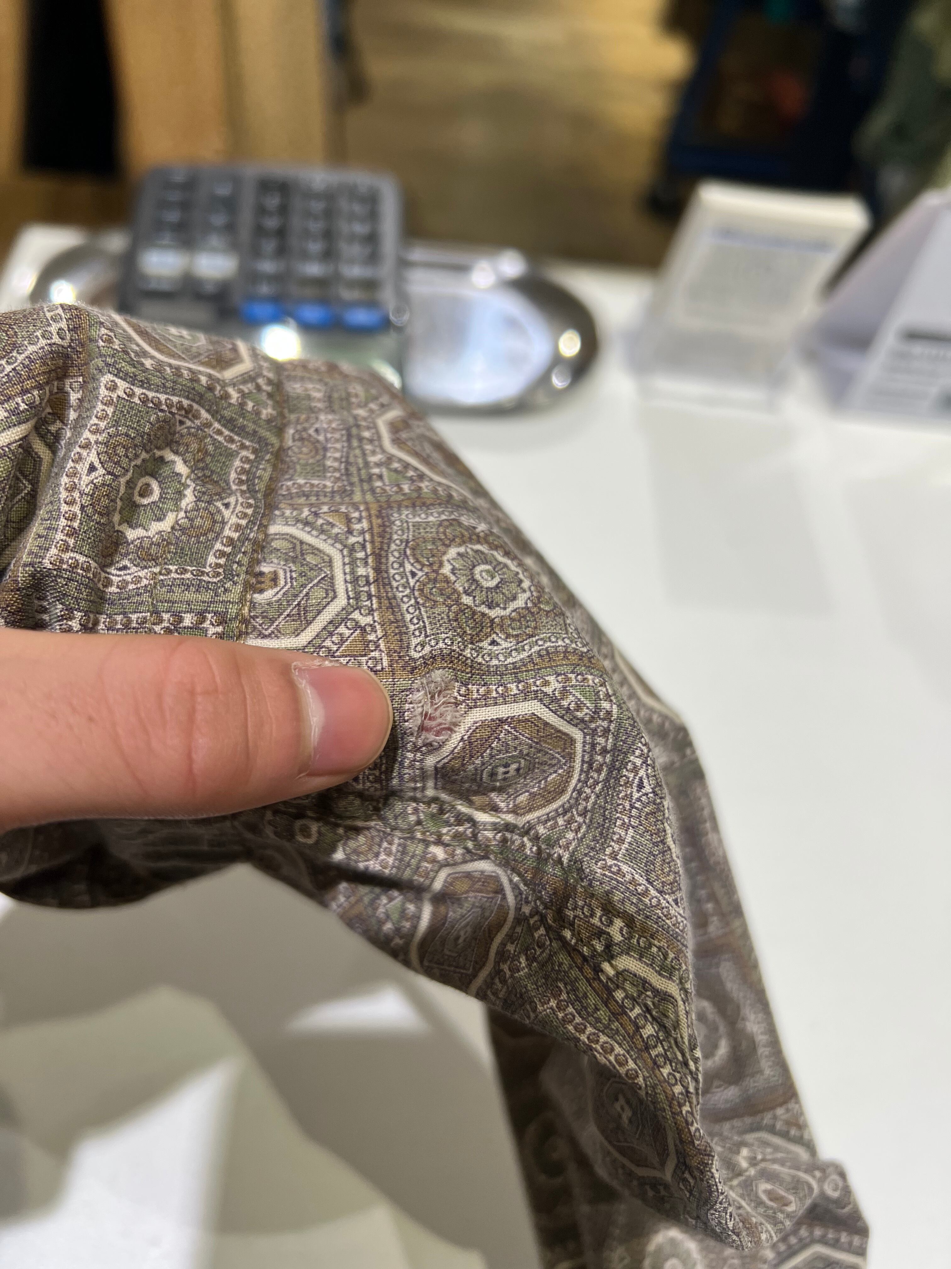 前裾に小さなほつれによるダメージがあります。