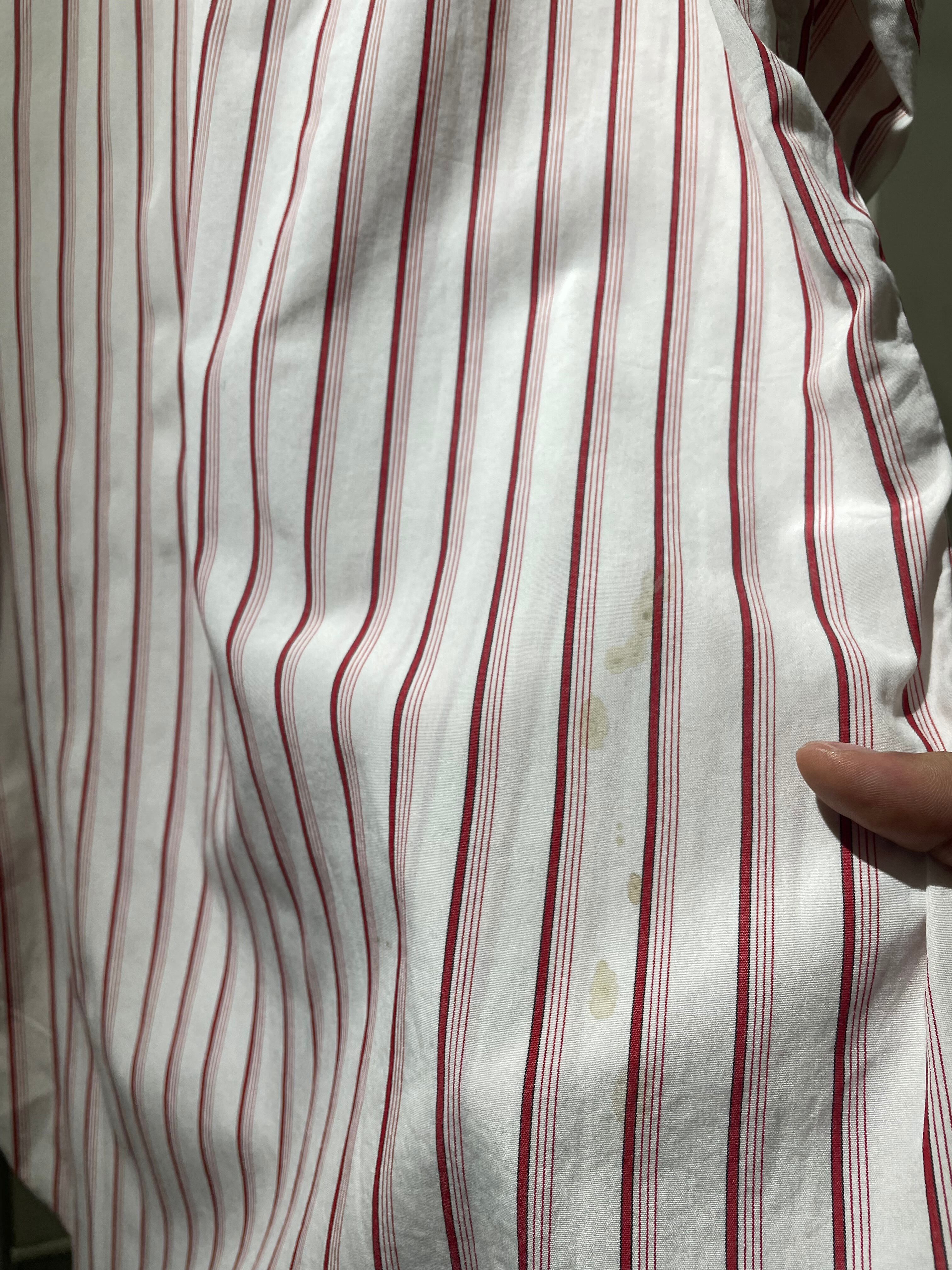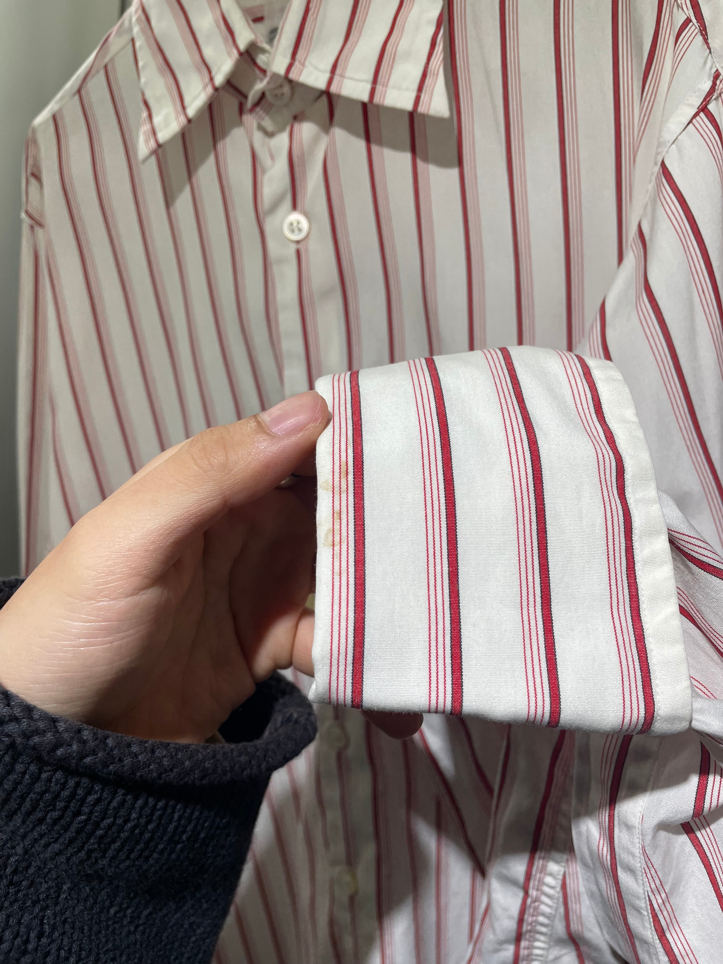 前面第6ボタン付近、左袖先、背面右脇腹、背面裾先、左肩に若干の薄汚れがあります。