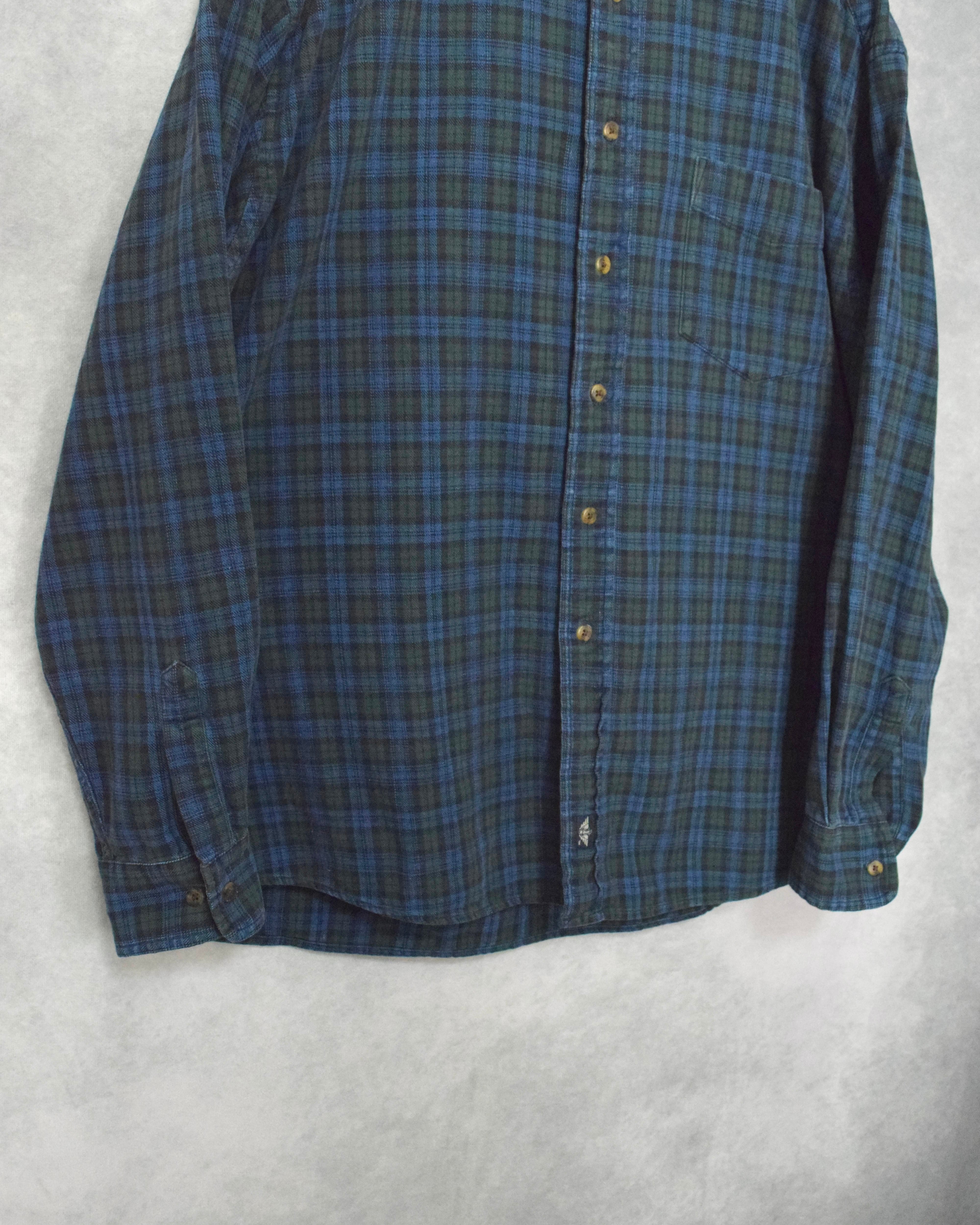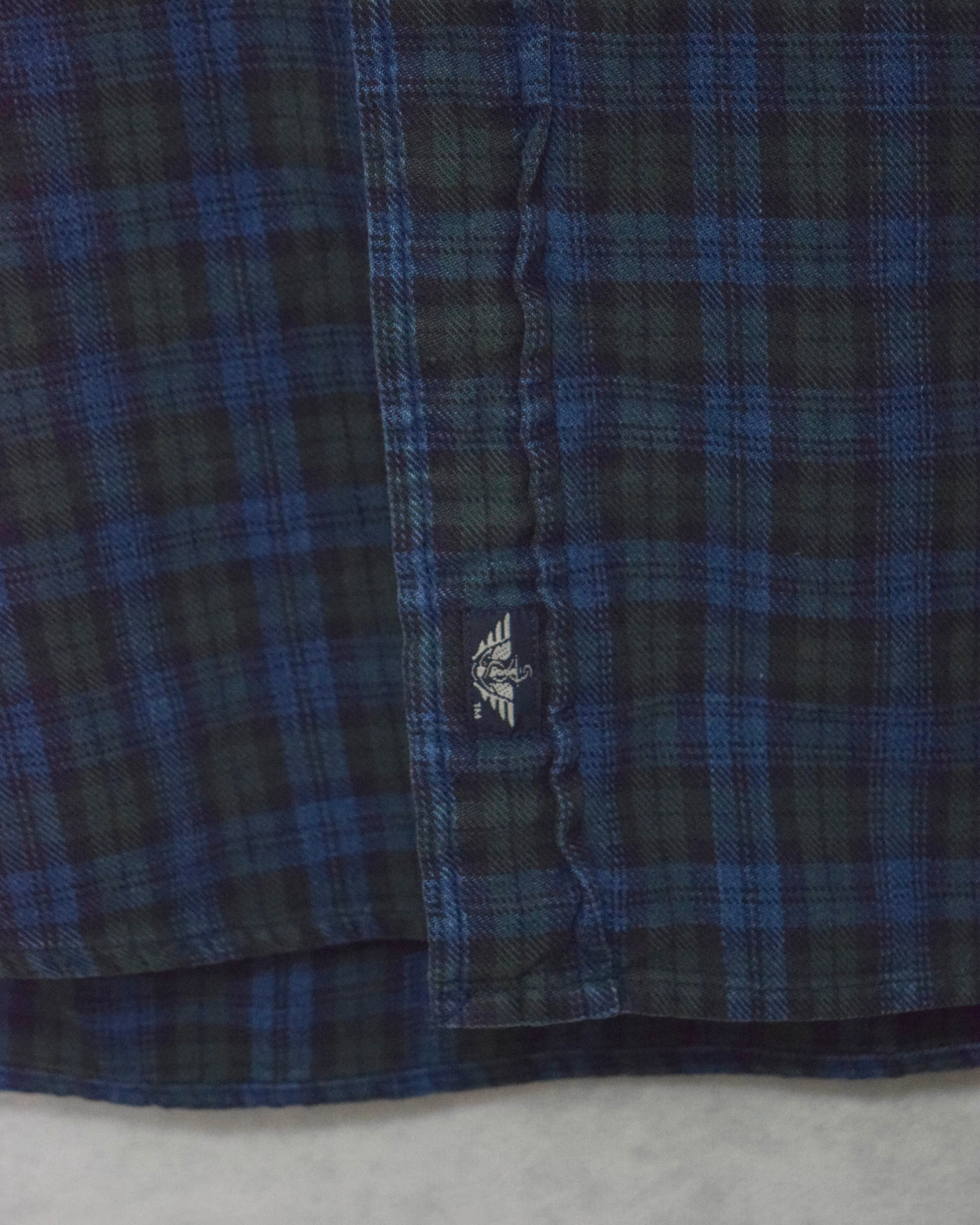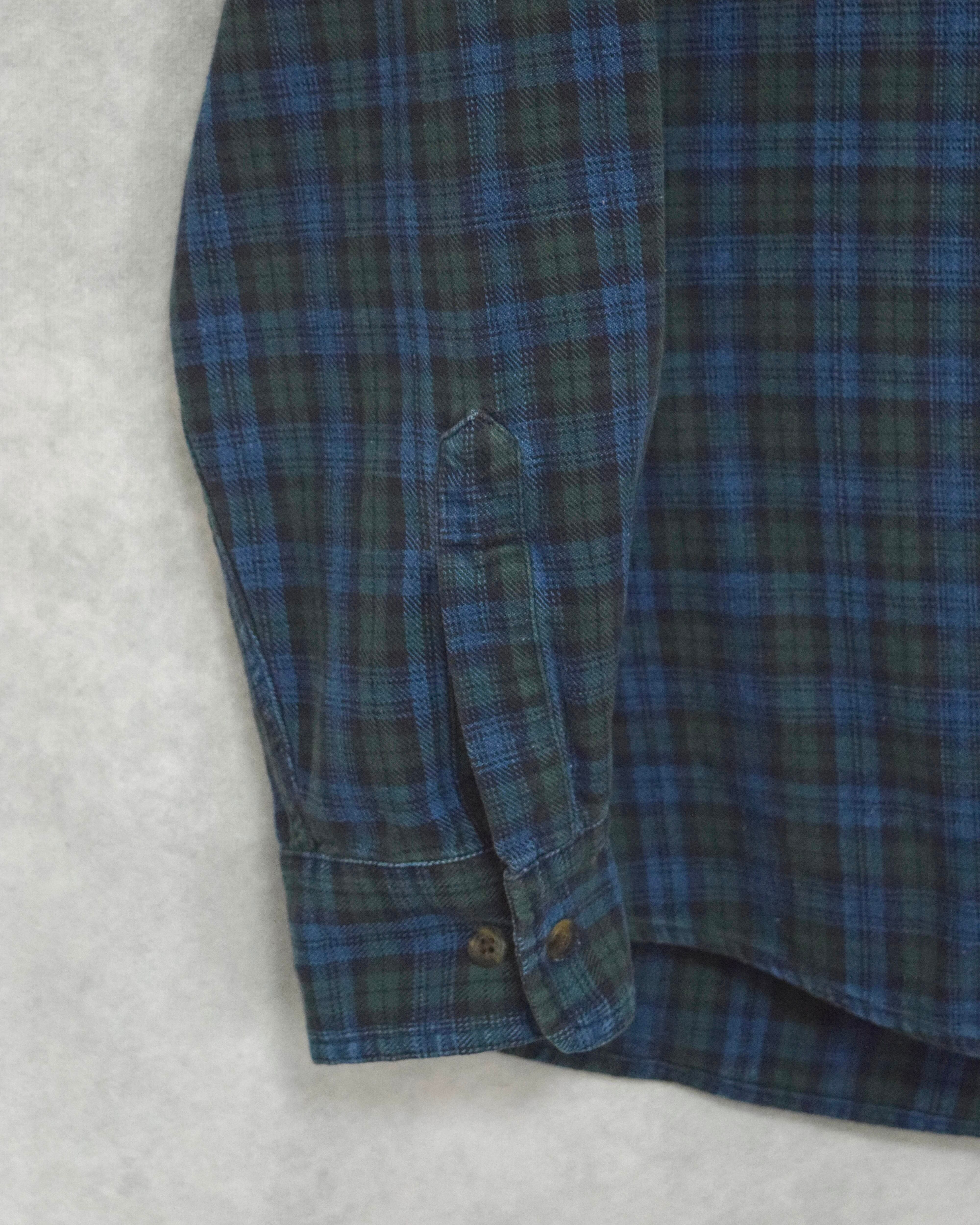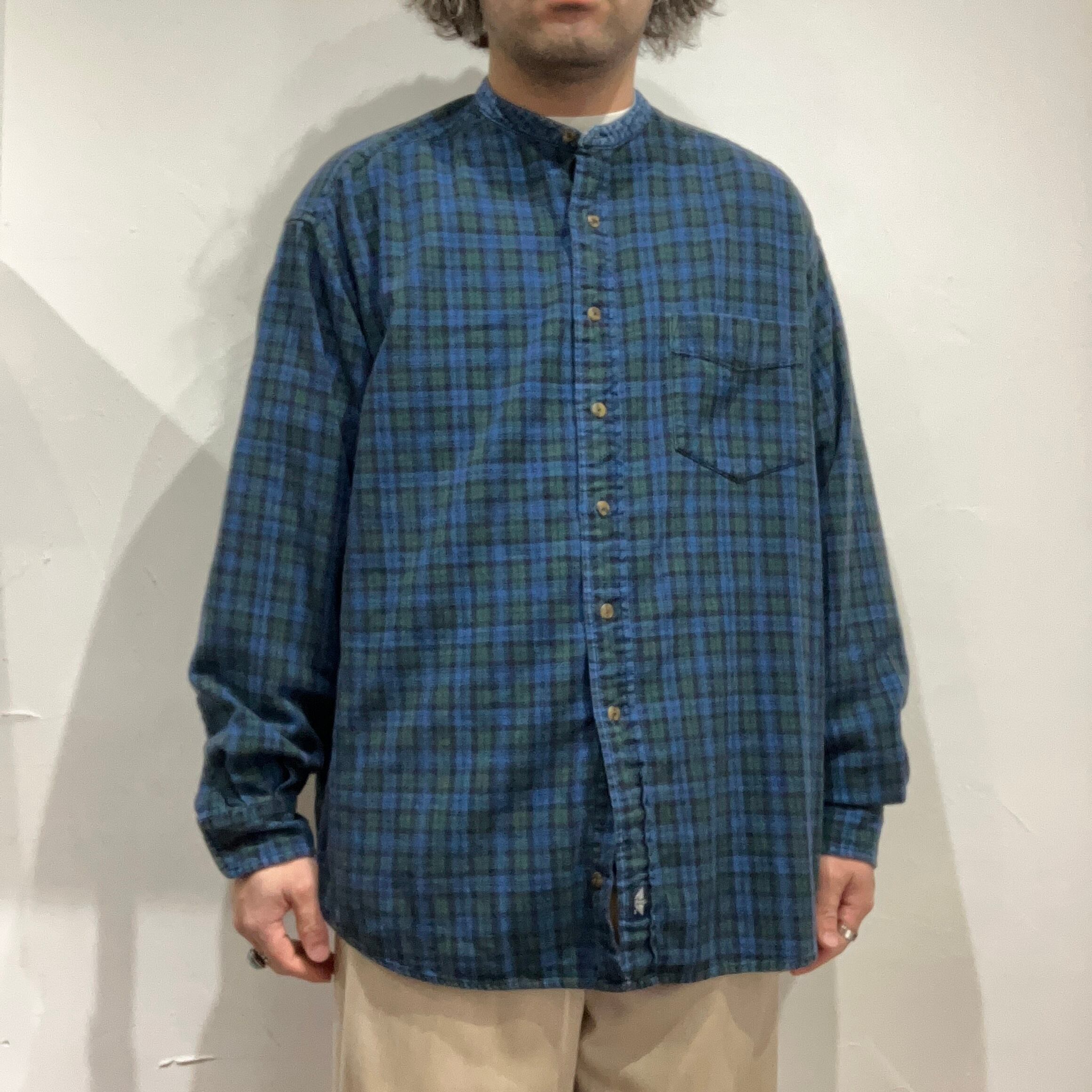 インディゴ染めされたチェック柄のボディ部分と襟だけデニムに切り替えられたスタンドカラーシャツ。