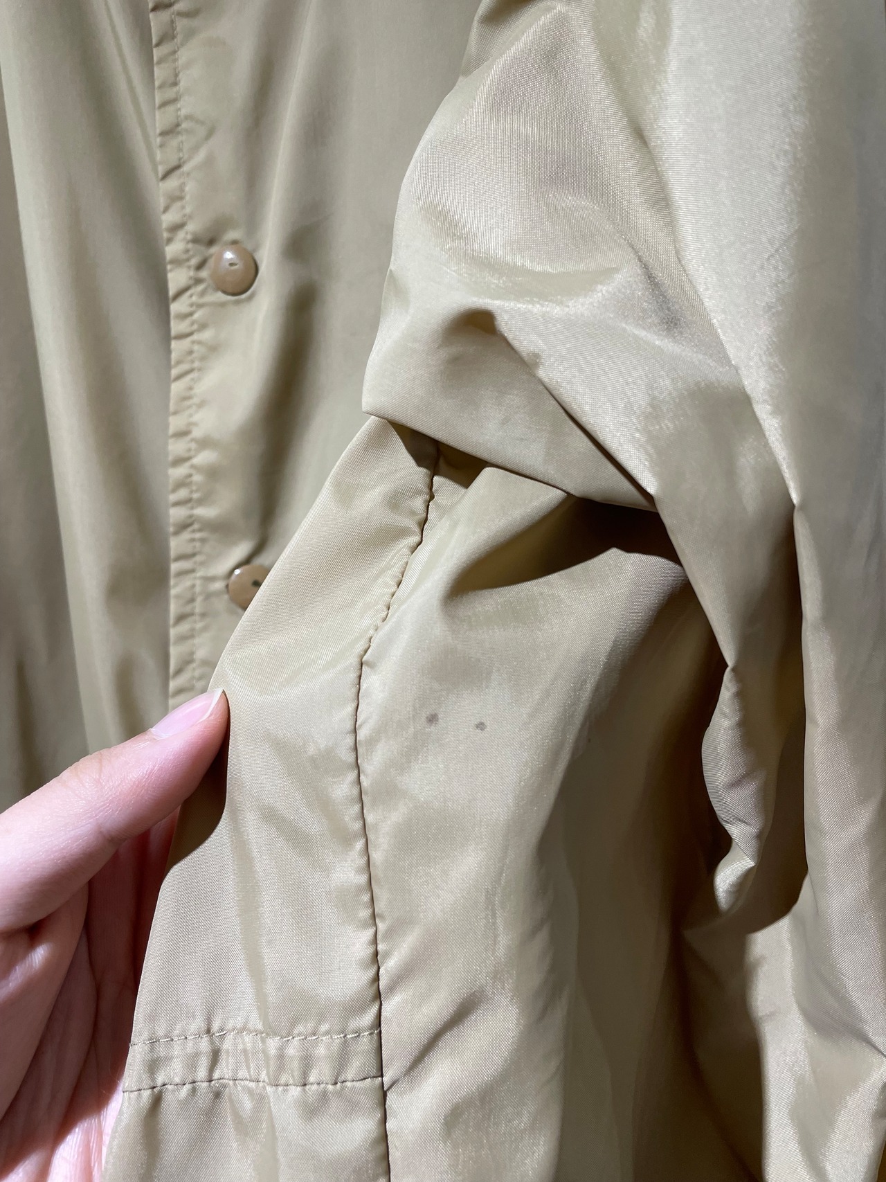 第5ボタン付近、左脇に1〜2mmほどの小さな薄汚れがあります。