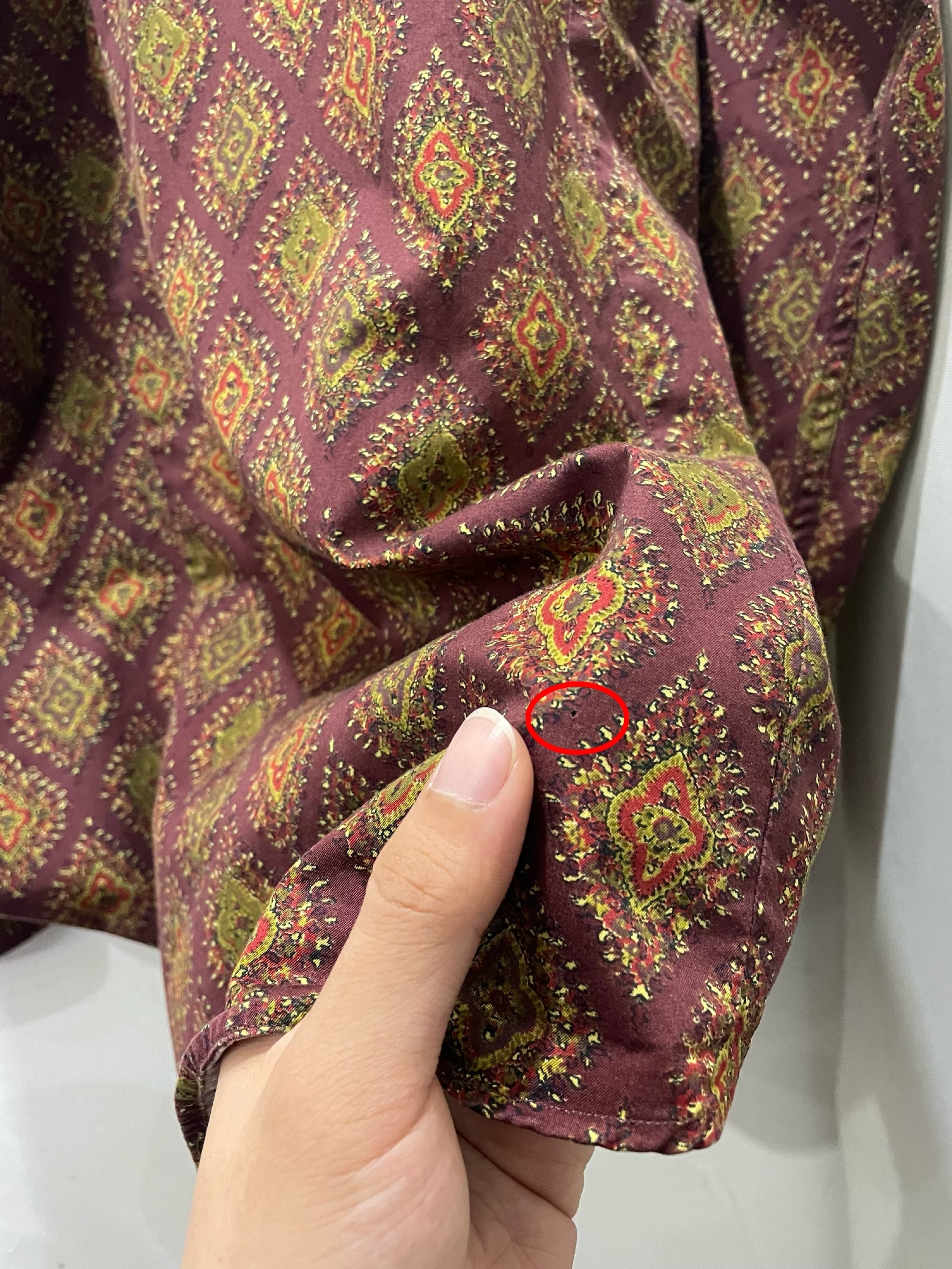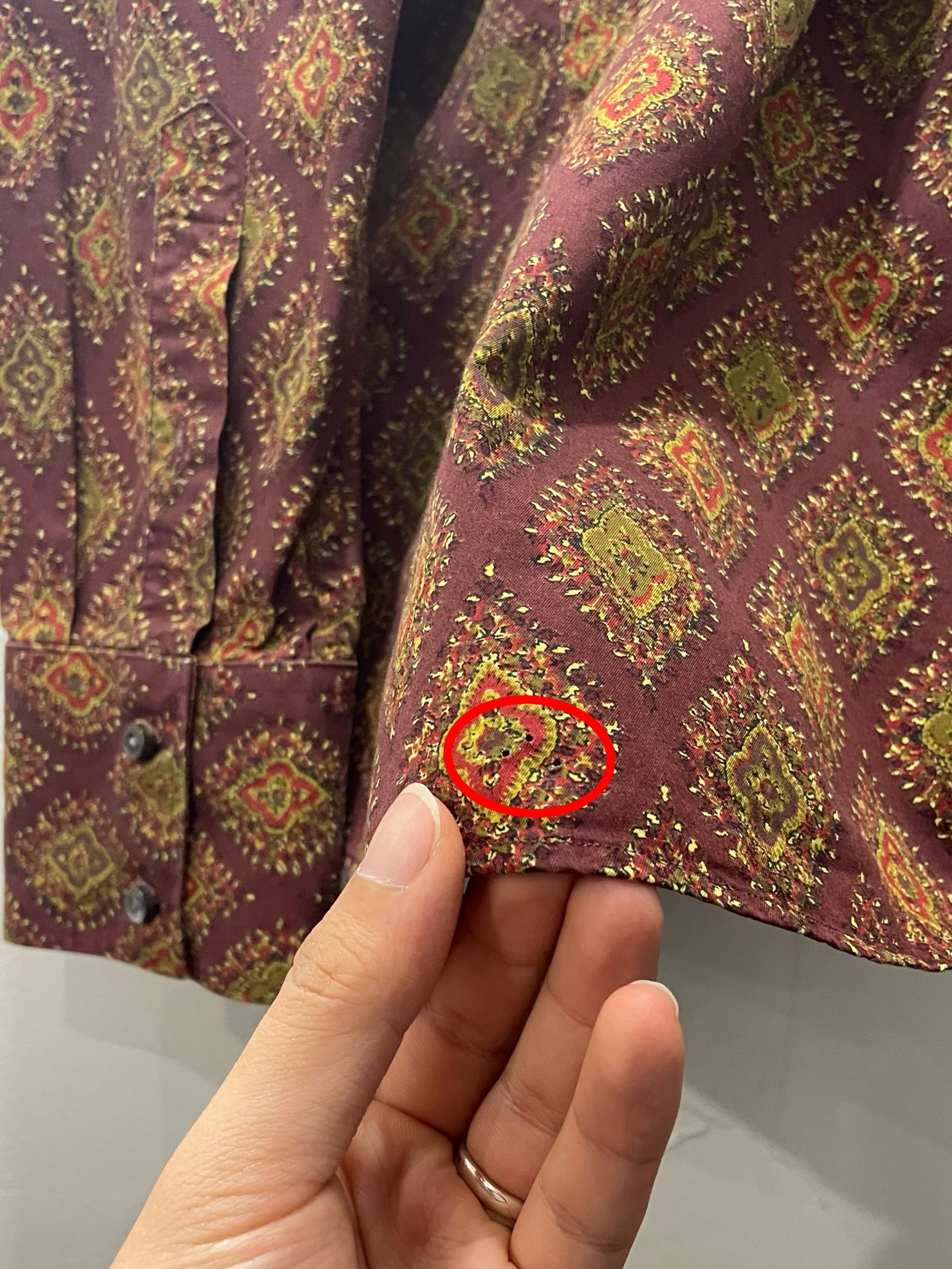 背面裾に1mm程度の小穴が4箇所ありますが、色柄も相まってほとんど気になりません。