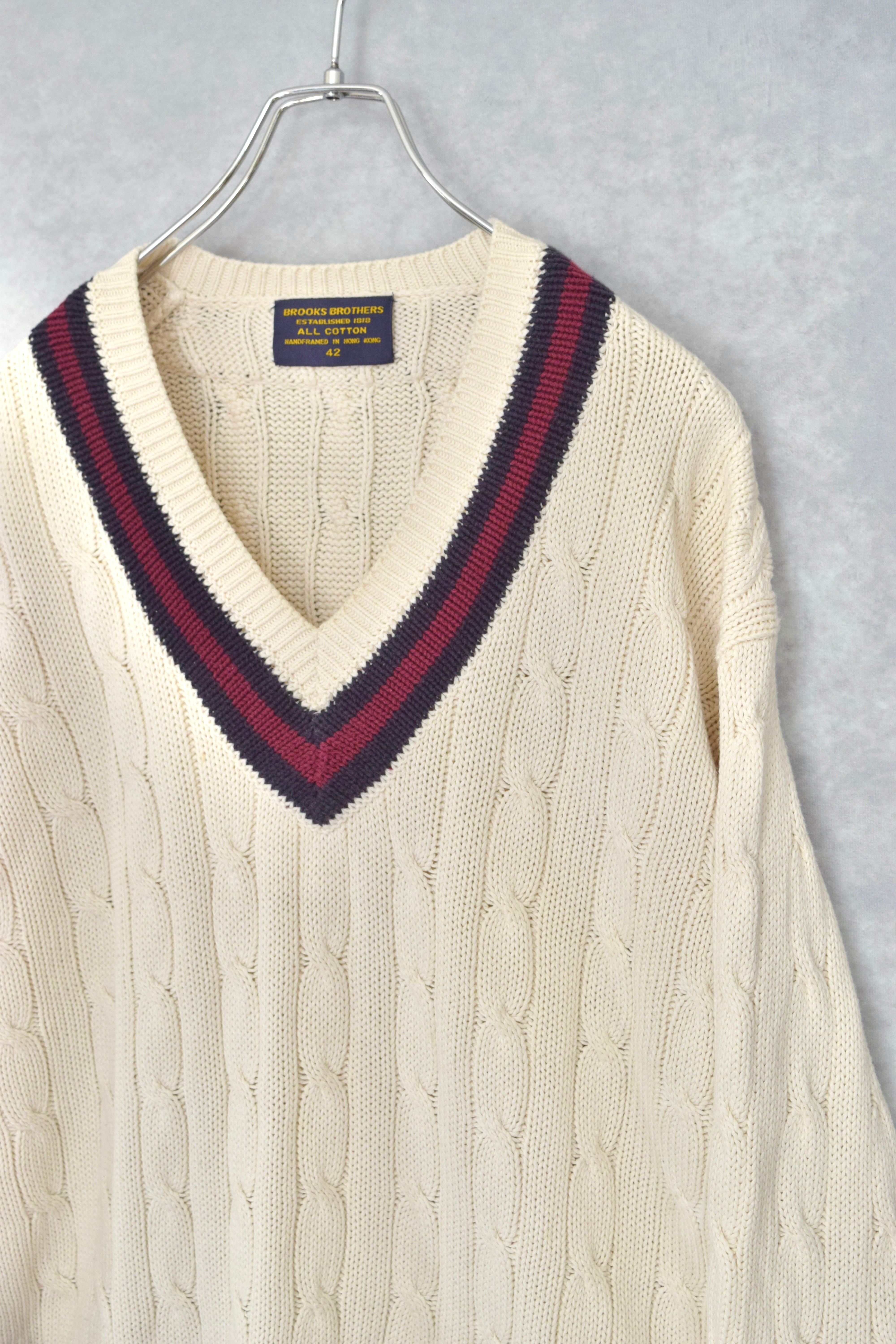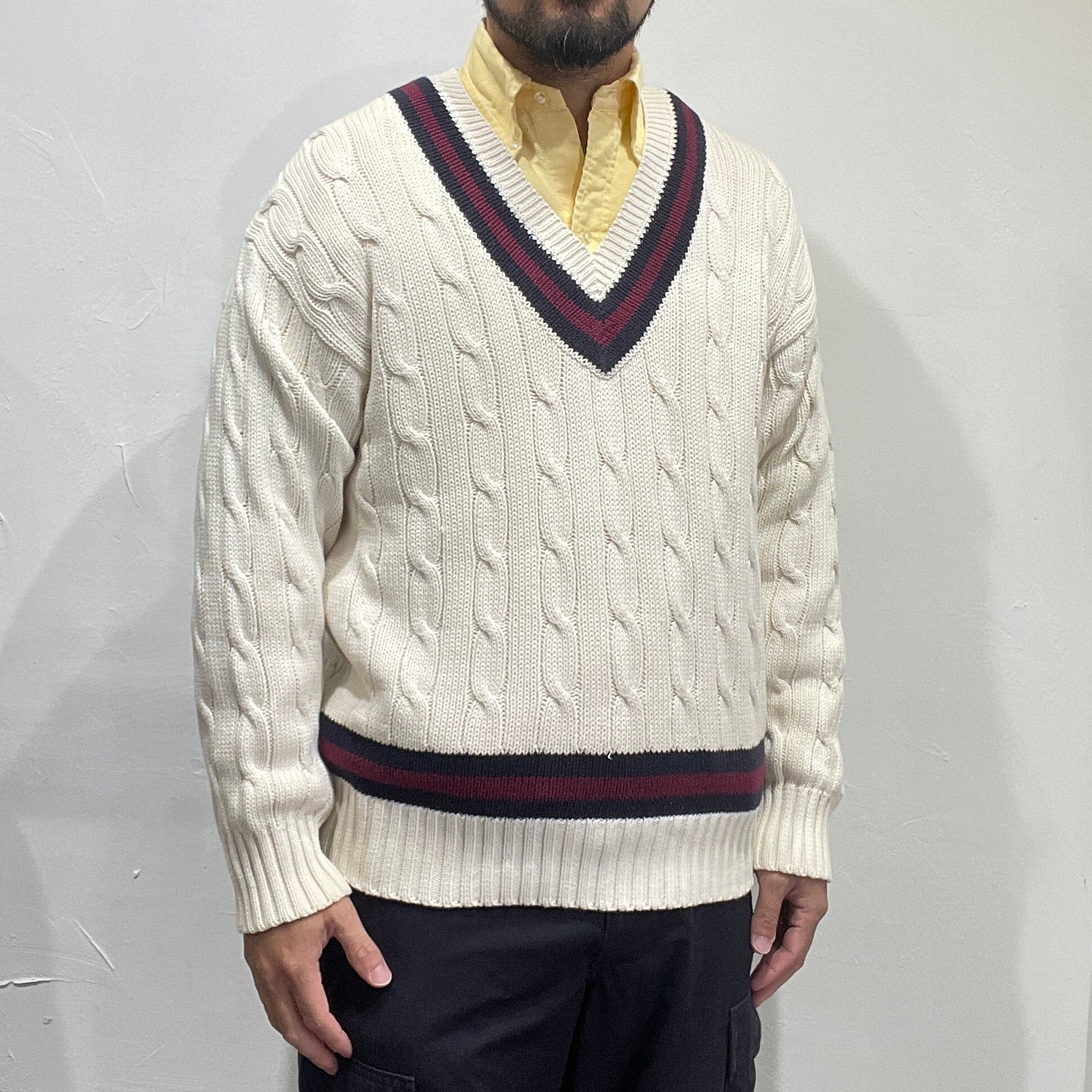 ホワイトのケーブルあみのボディに首元と裾にはネイビーとワインレッドのライン。