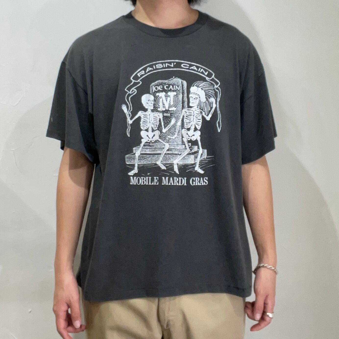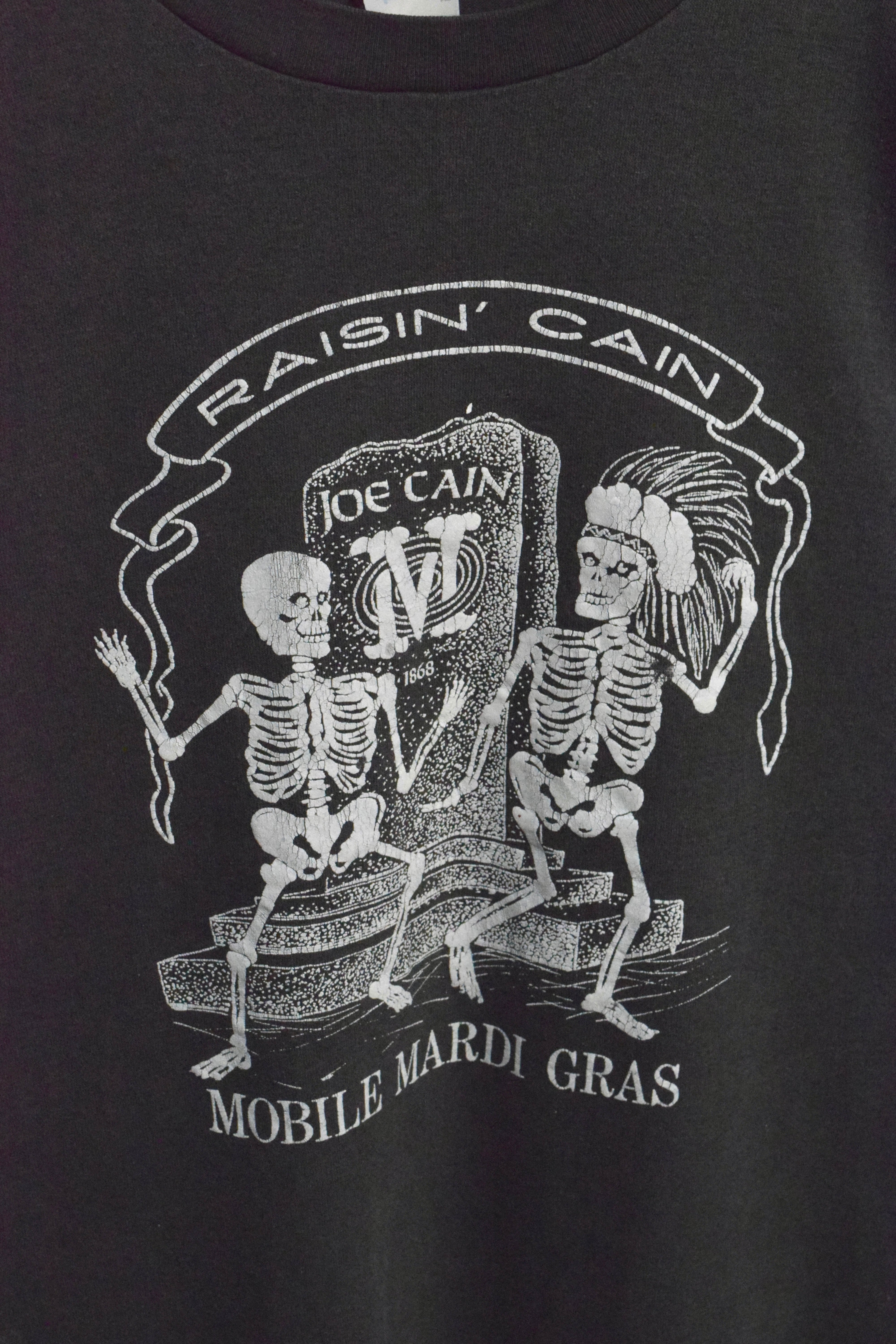2体のガイコツがお墓の前で愉快に踊っているようなプリント。
