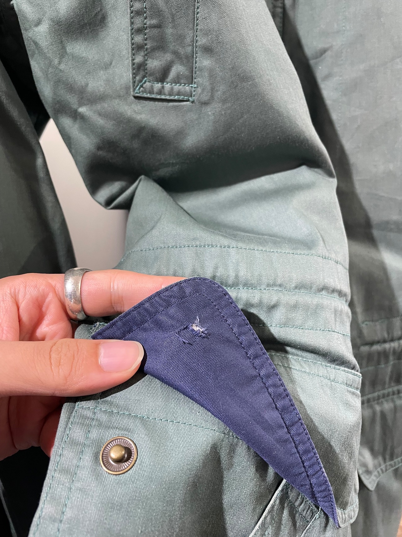 裾ポケ右手側のフラップのスナップボタンが一つ欠損しています。