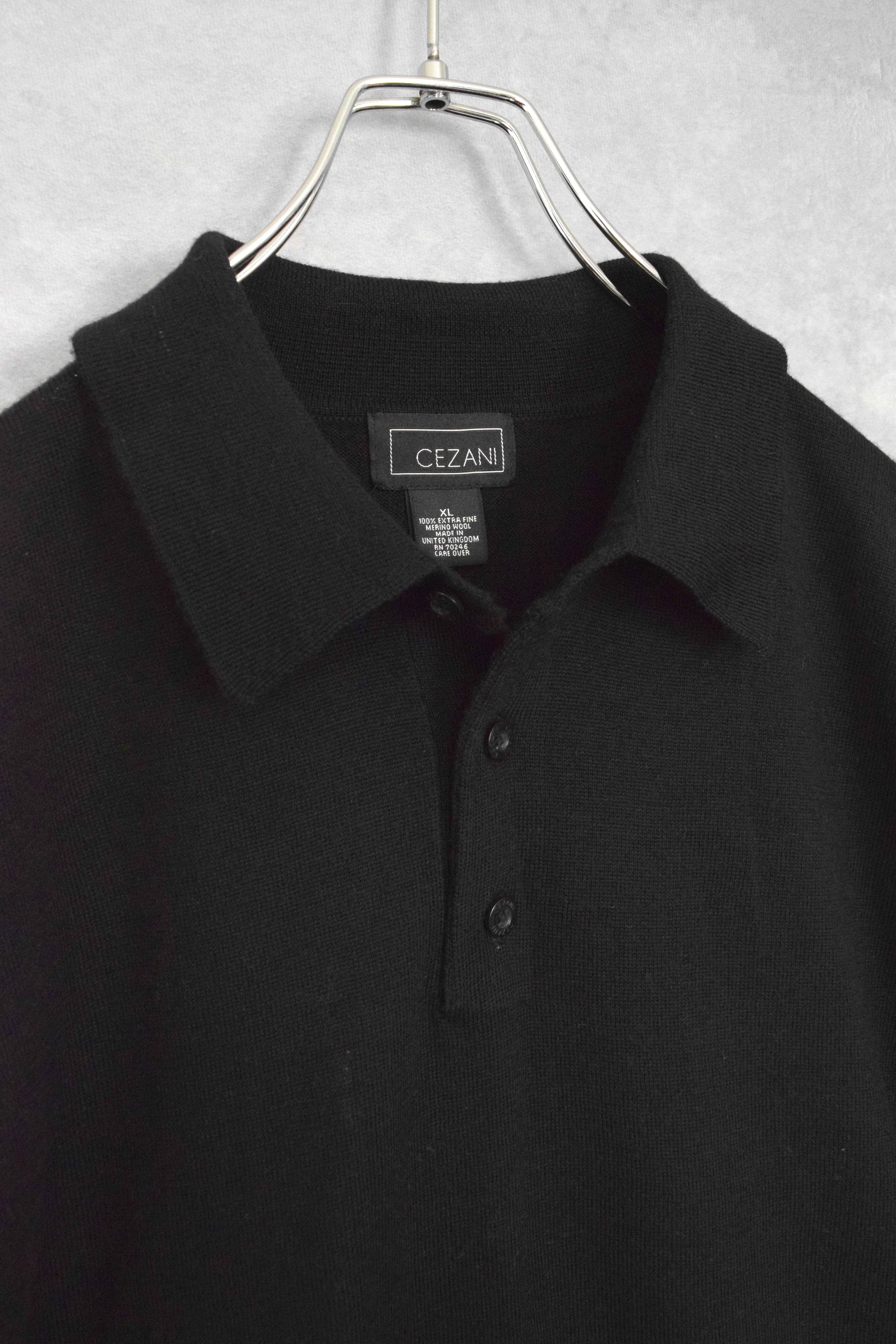 black merino wool hi gauge knit polo shirt / made in U.K / size XL